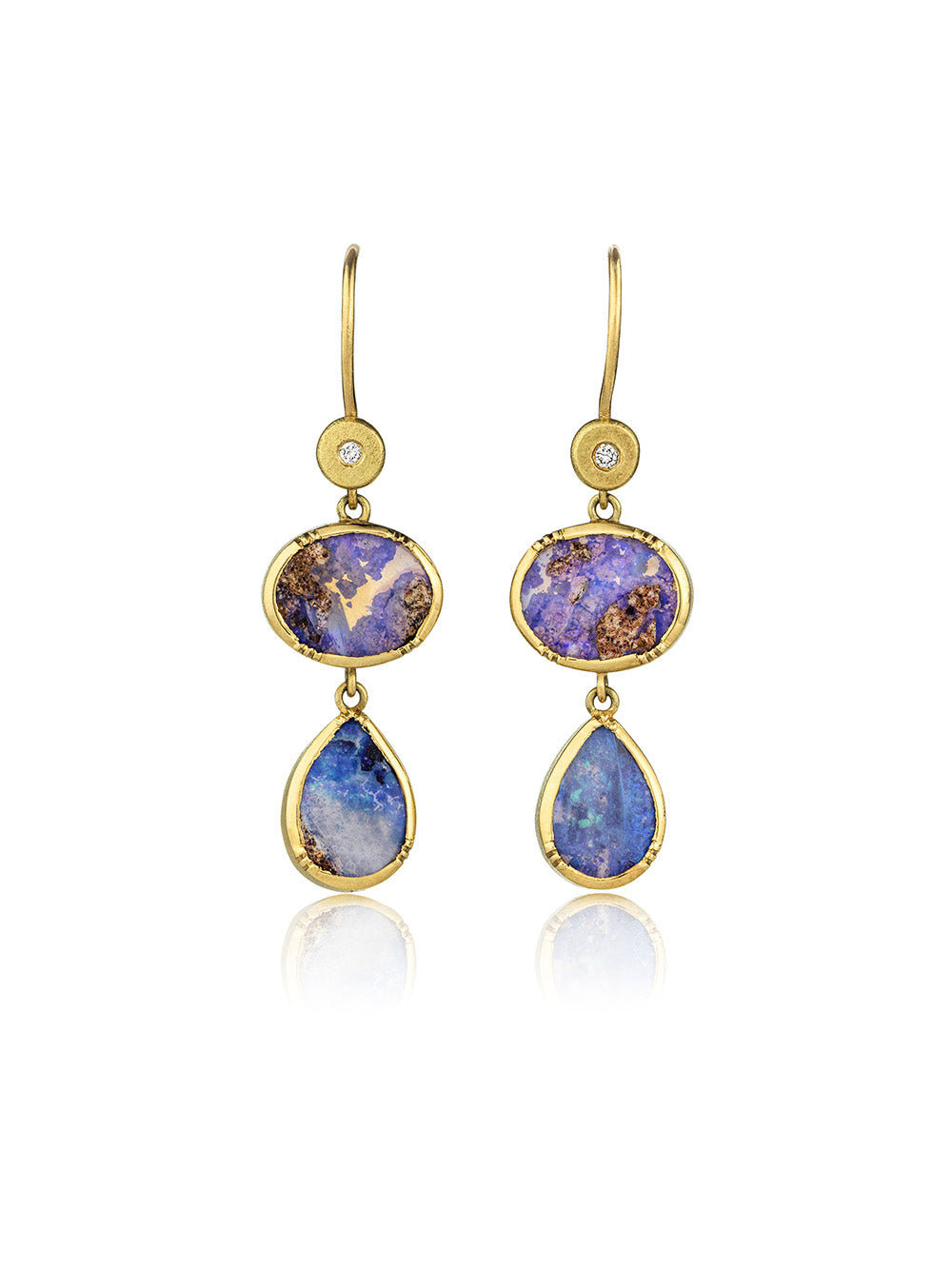 Boucle d'oreille Ellipse signées Brooke Gregson confectionnée en opal de bois montée sur de l'or 18 carats. Une paire de style géorgien pendant, en forme de goutte. Une pièce rare et unique dont la pierre est issu de bouts de bois ensevelis pendant de nombreuses années.