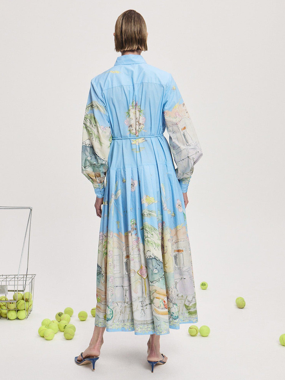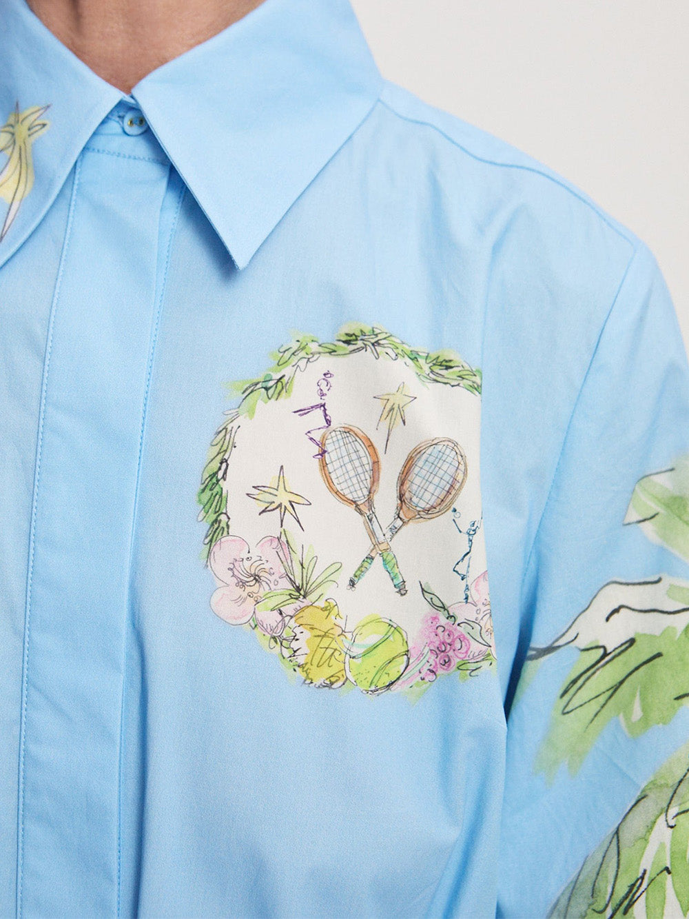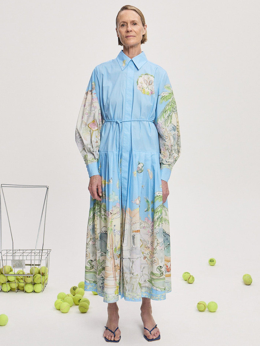 Anouk shirt dress by Alémais, crafted from sky blue organic cotton with a print featuring sports and outdoor motifs. The print was designed by artist Anouk Colantoni in a watercolor style with soft colors.