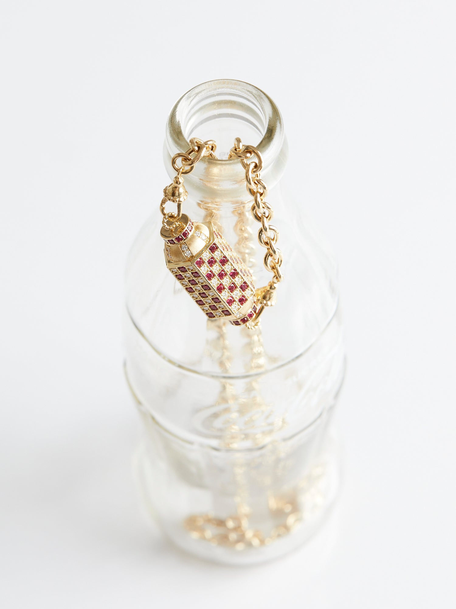 This Locket Check necklace in yellow gold by designer Marie Lichtenberg is set with white and ruby diamonds. Made in Italy