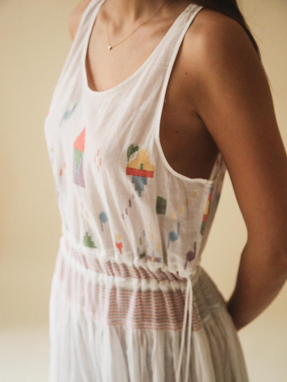 Malin Dress by Jane Gustavsson made of "Jamdani" hand woven cotton. A long dress adjustable at the waist for a ruched effect.