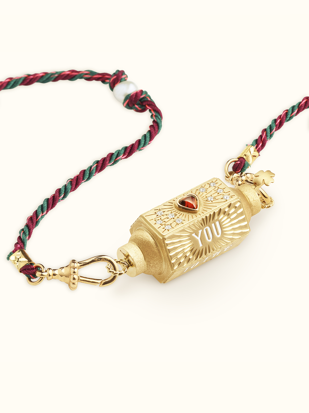 Marie Lichtenberg's Locket Love You necklace is crafted in 14k yellow gold and diamonds. A garnet heart is at the center of the locket.