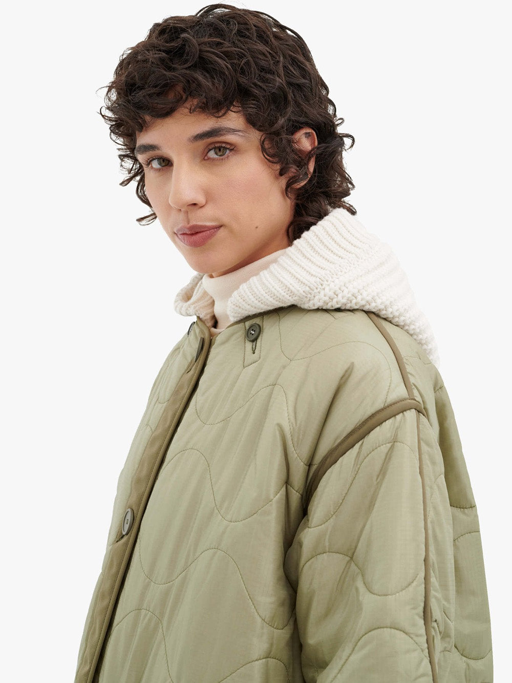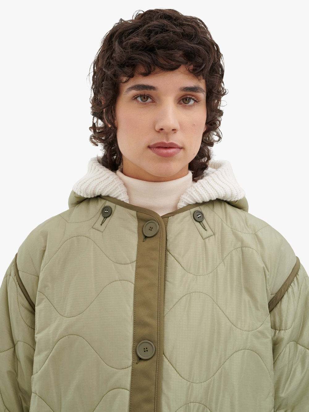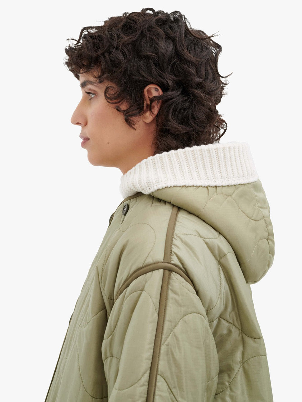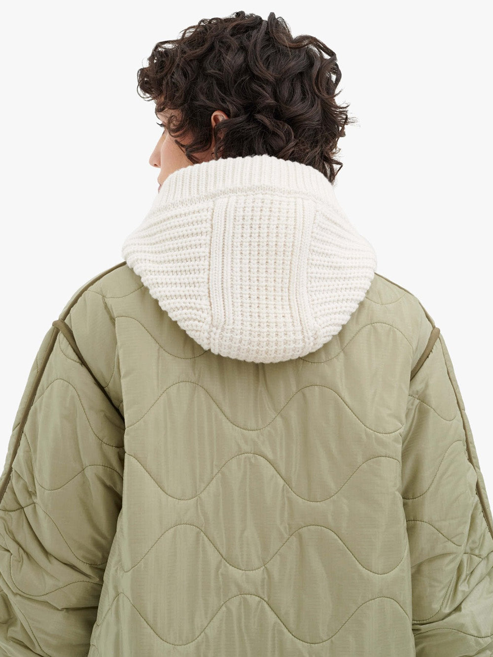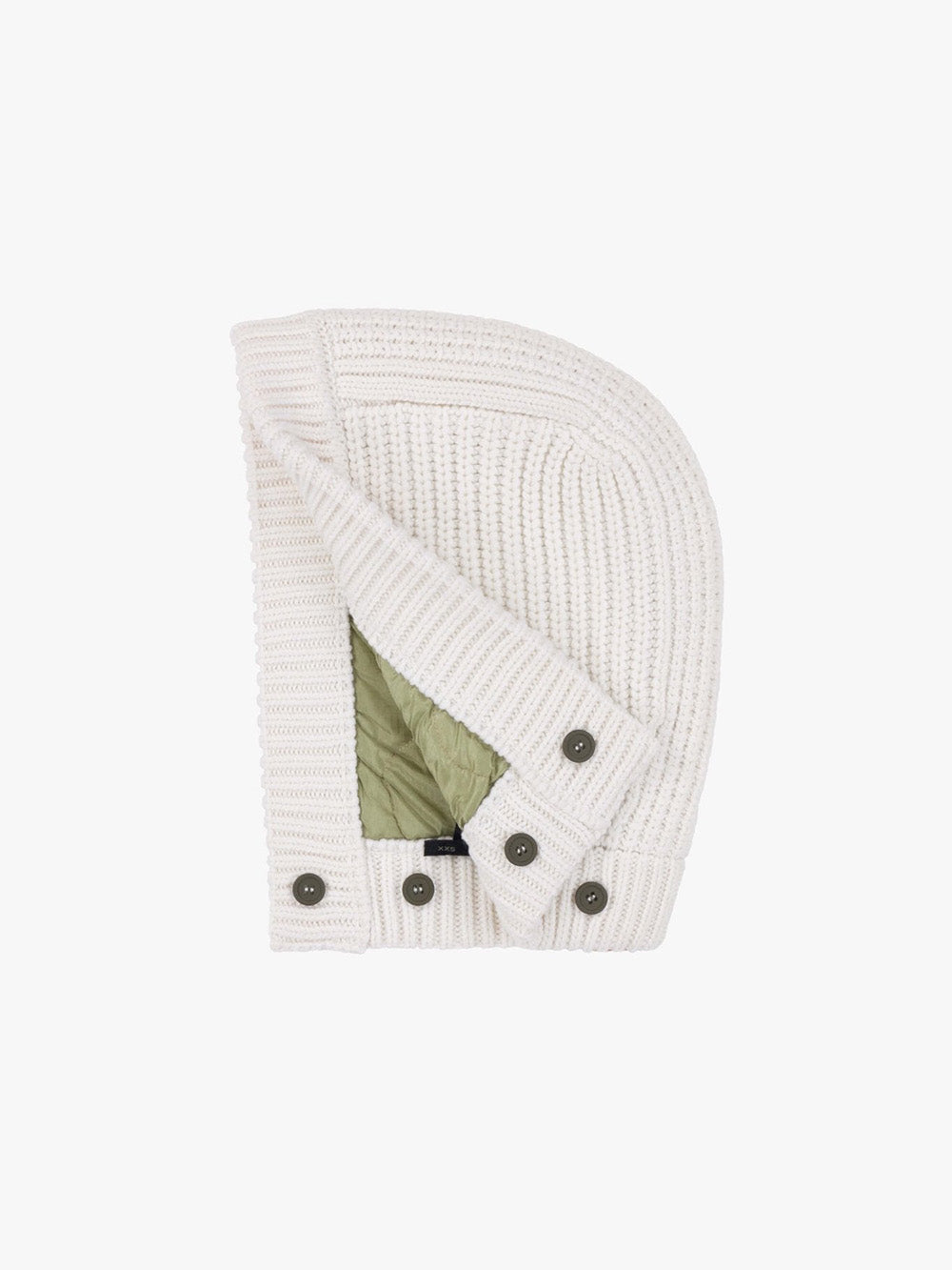 Marfa Stance's knitted hood features an ivory wool and cashmere knit on one side and a quilted sage green nylon side. A reversible hood that attaches to your parka.