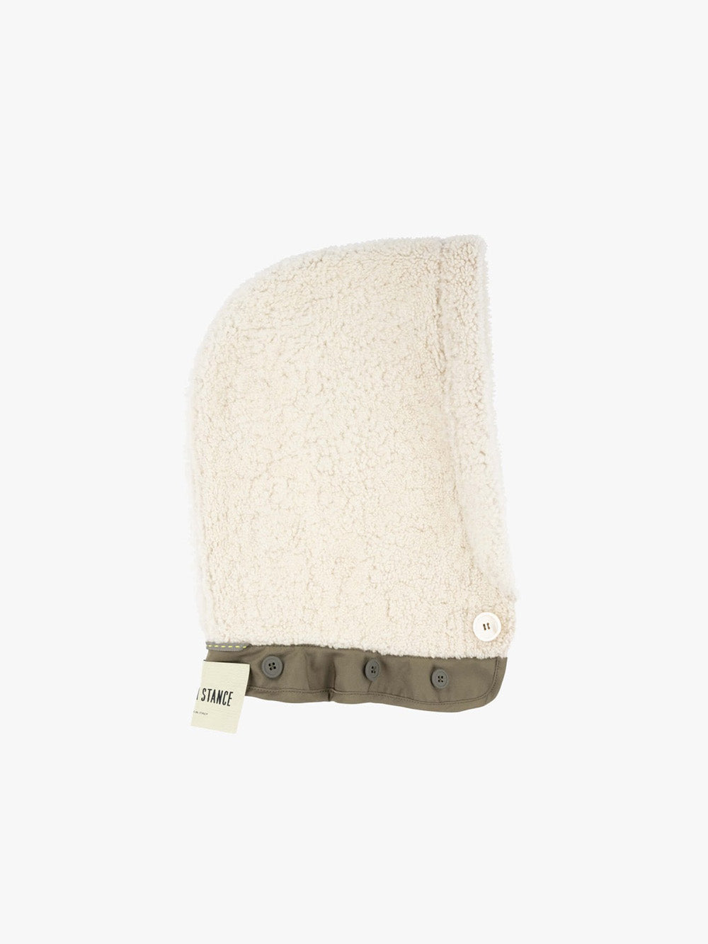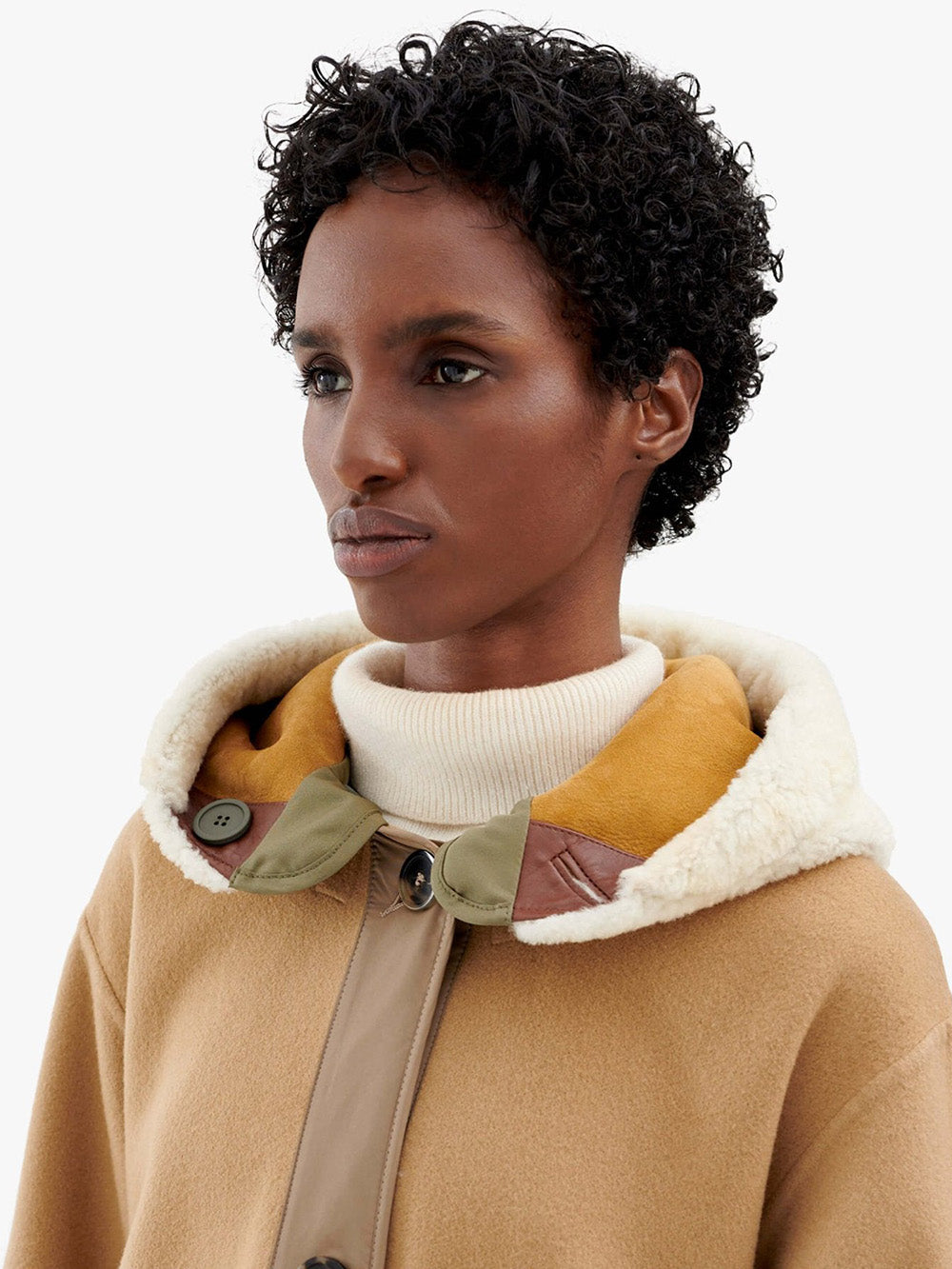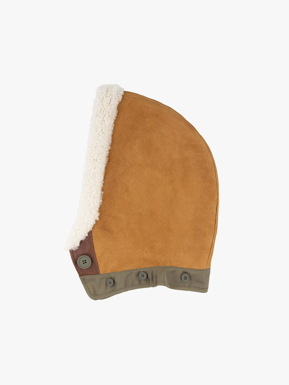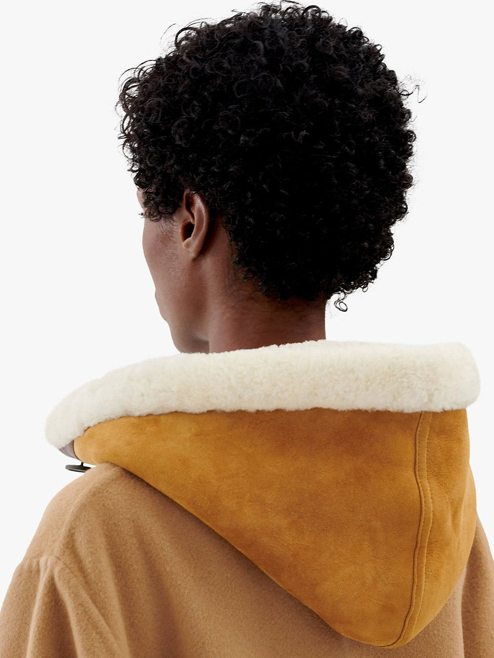 Marfa Stance Tan Shearling Hood crafted from tan Italian leather on one side and off-white shearling on the other. A reversible hood to attach to your parka.