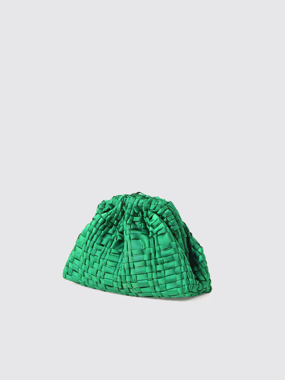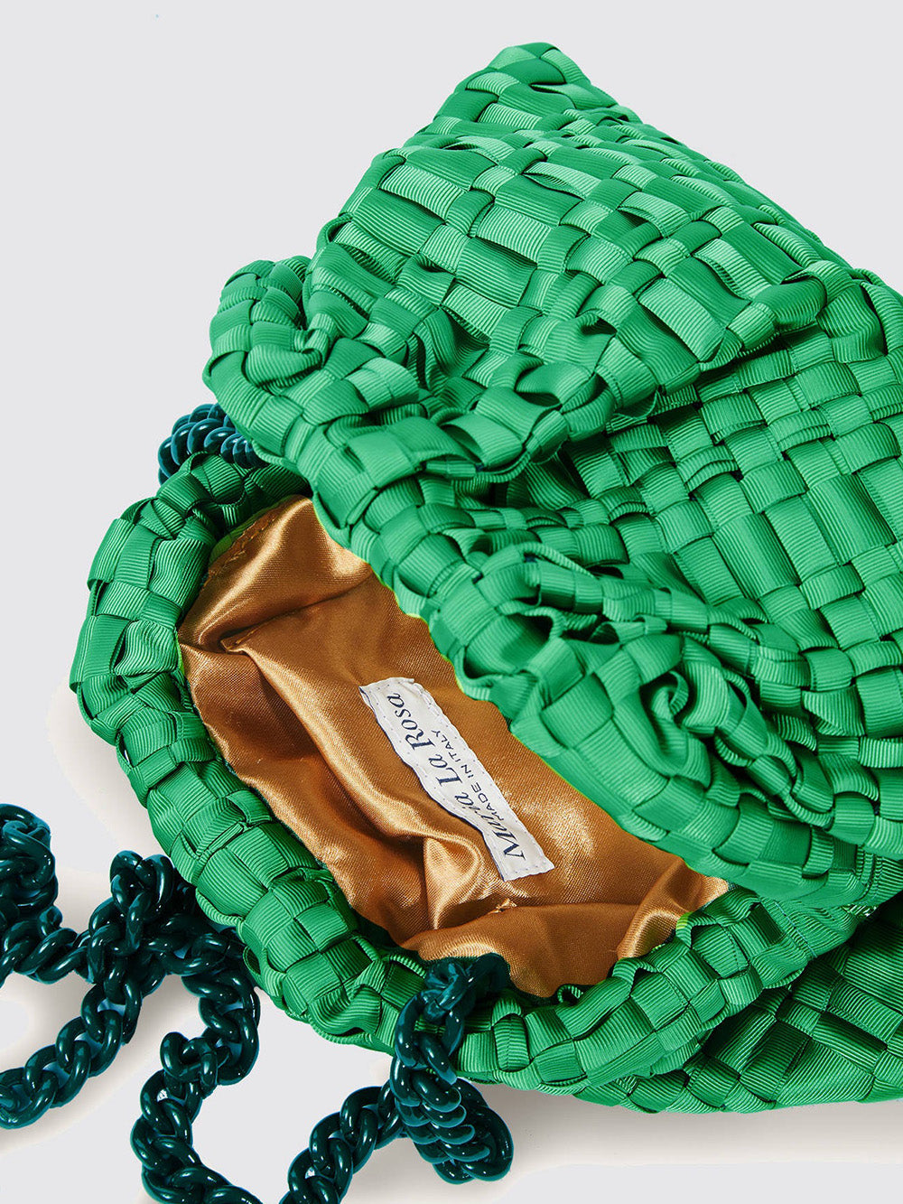 Maria La Rosa's Mini Game Bag is crafted from handcrafted green woven ribbon fabric. It has a magnetic clasp and is fully lined in satin. A chain allows the bag to be carried over the shoulder or crossed.