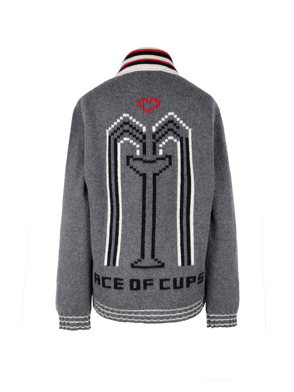 Ace Of Cup cardigan by Monoki, handcrafted in gray cashmere. The Ace Of Cup tarot card which symbolizes emotions, love and intuition is embroidered on the back. Handmade in India