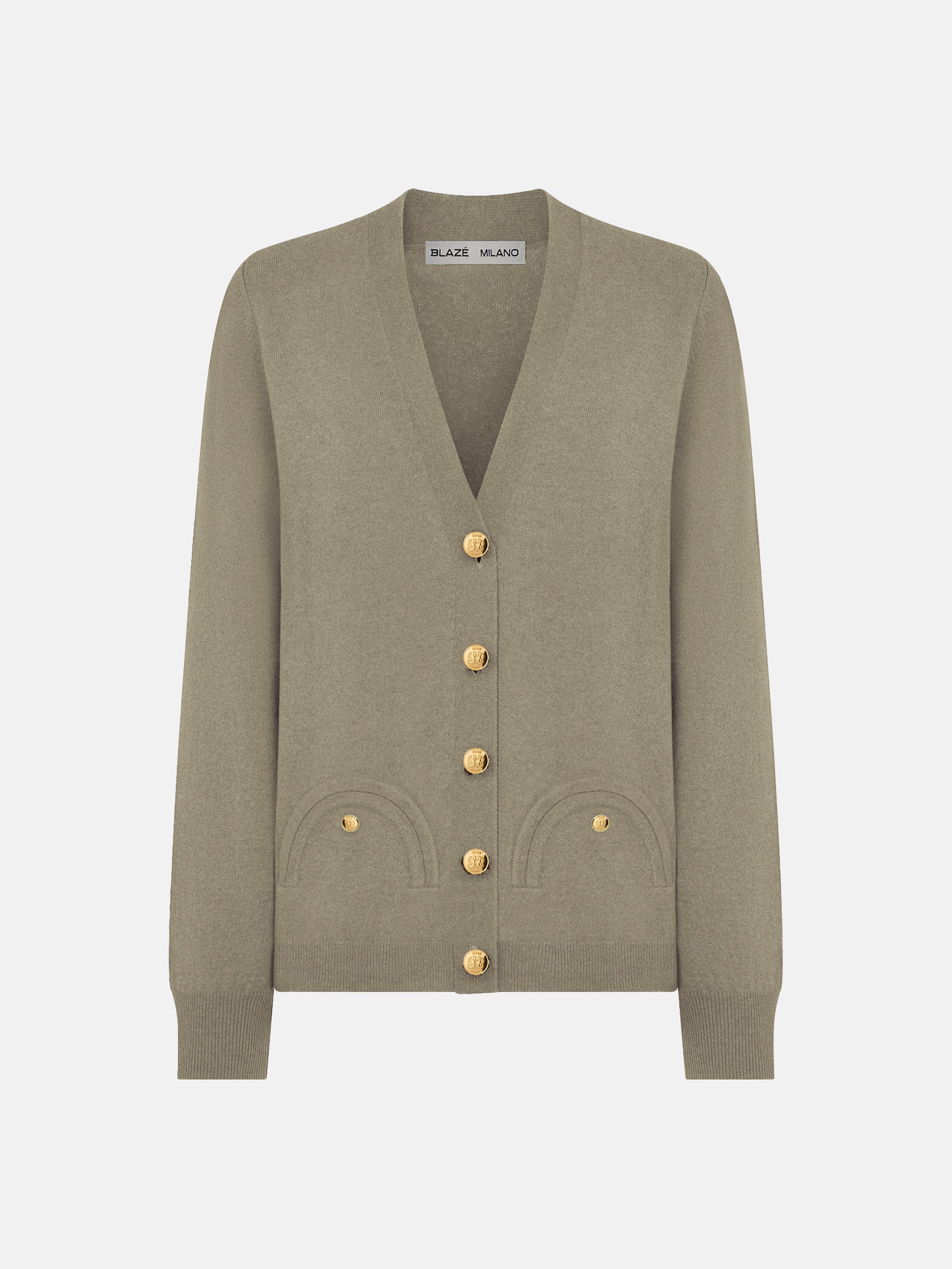 Blazé Milano's Highland Fieno cardigan is crafted from an almond green wool and cashmere blend. A V-neck cardigan with signature arched pockets.