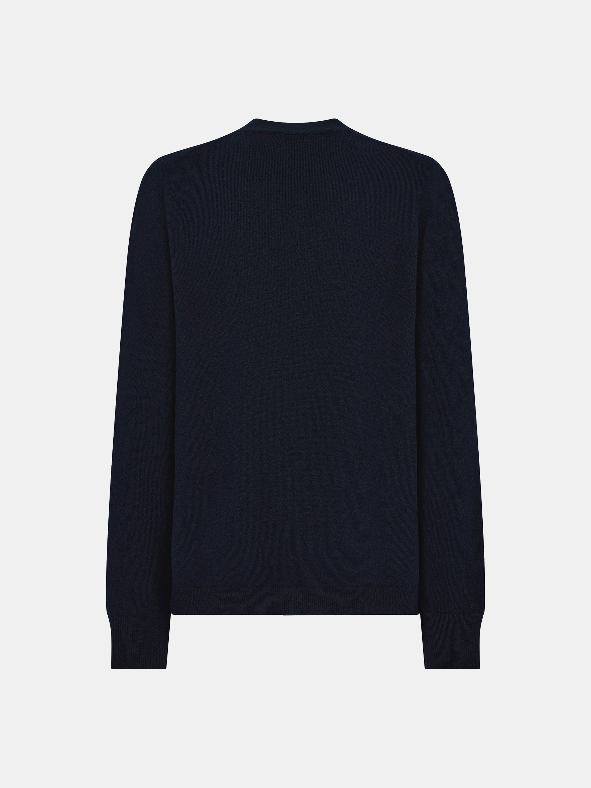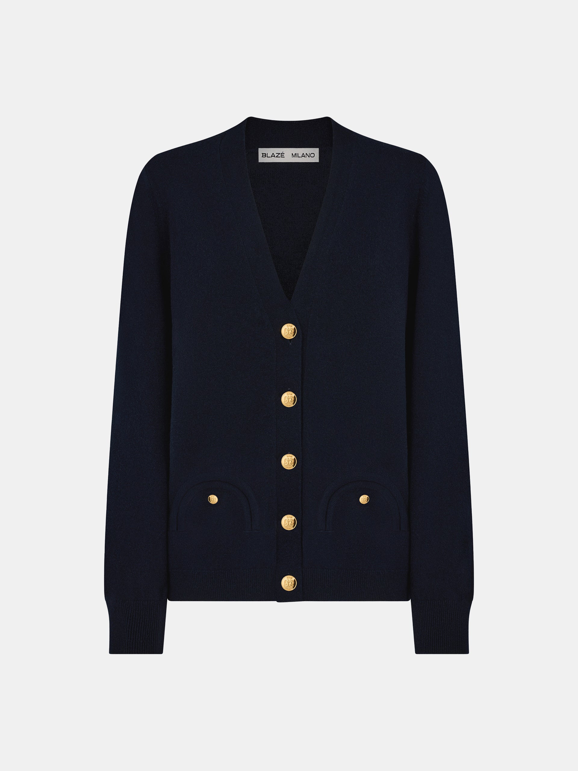 Blazé Milano's Highland Marino cardigan is crafted from a navy wool and cashmere blend. A V-neck cardigan with signature arched pockets.