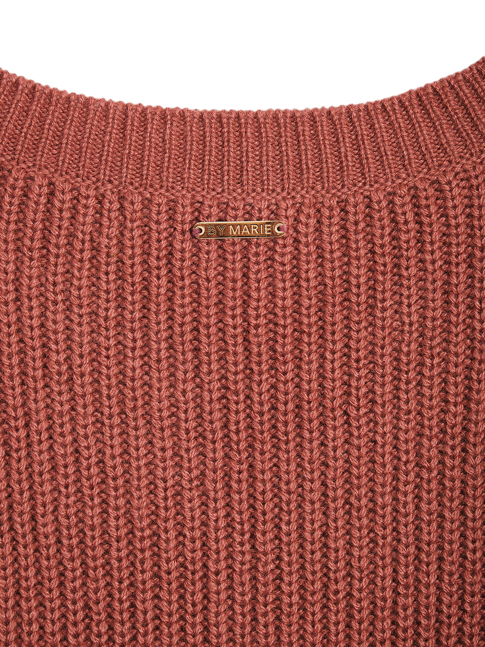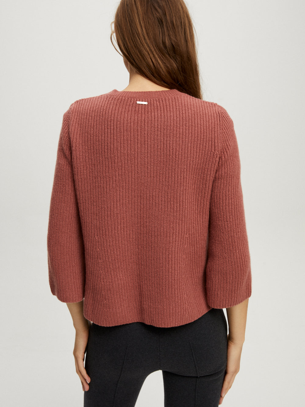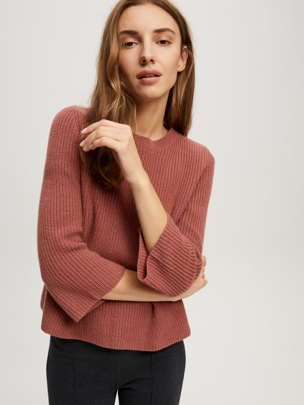 Flare sweater by BY MARIE Collection made from 100% cashmere in an old rose color. BY MARIE cashmere is made in limited editions by hand using an antique knitting machine in an organization in Nepal that has existed for 20 years. This company is composed mainly of women and, like us, is committed to passing on quality know-how.