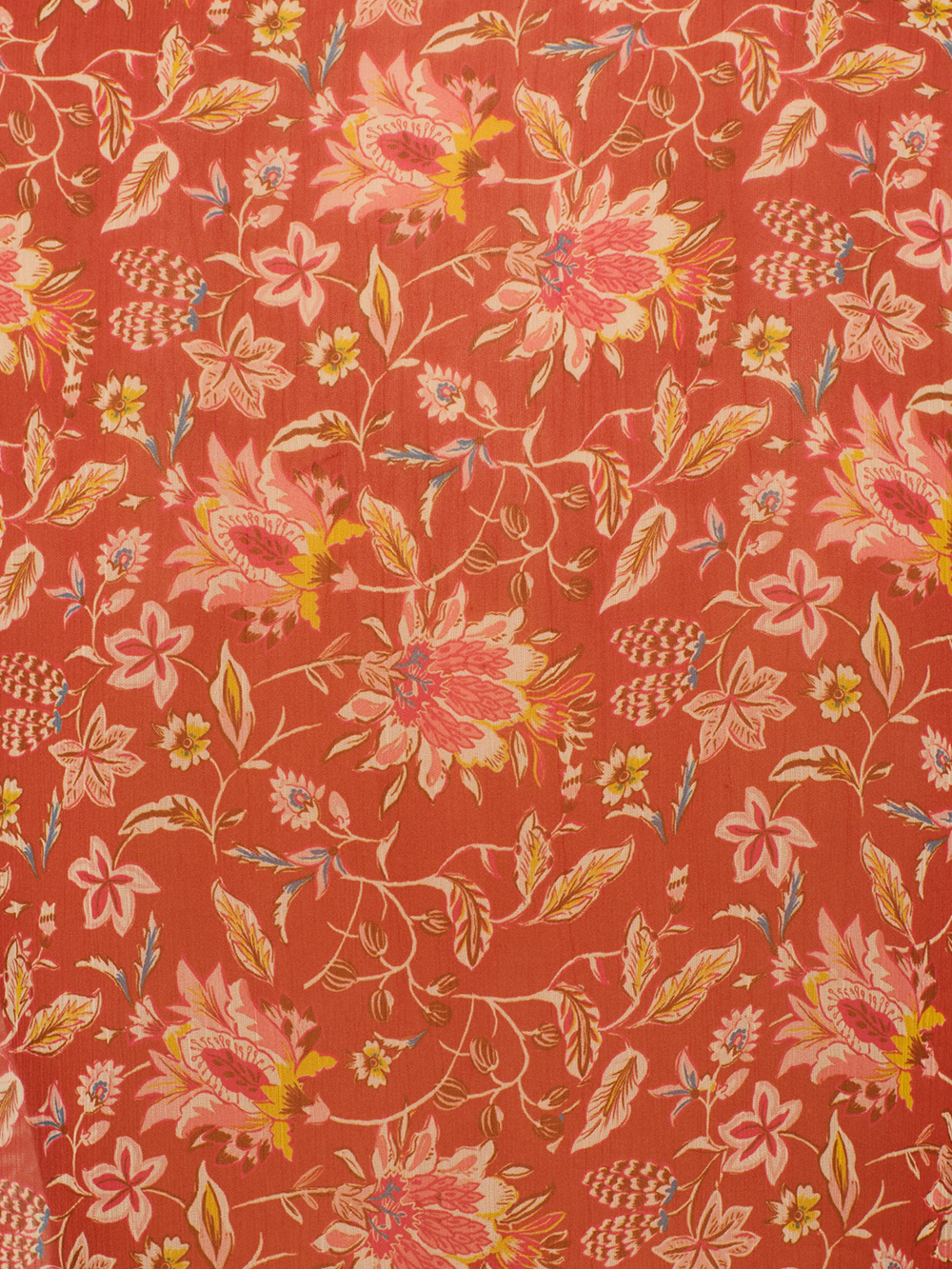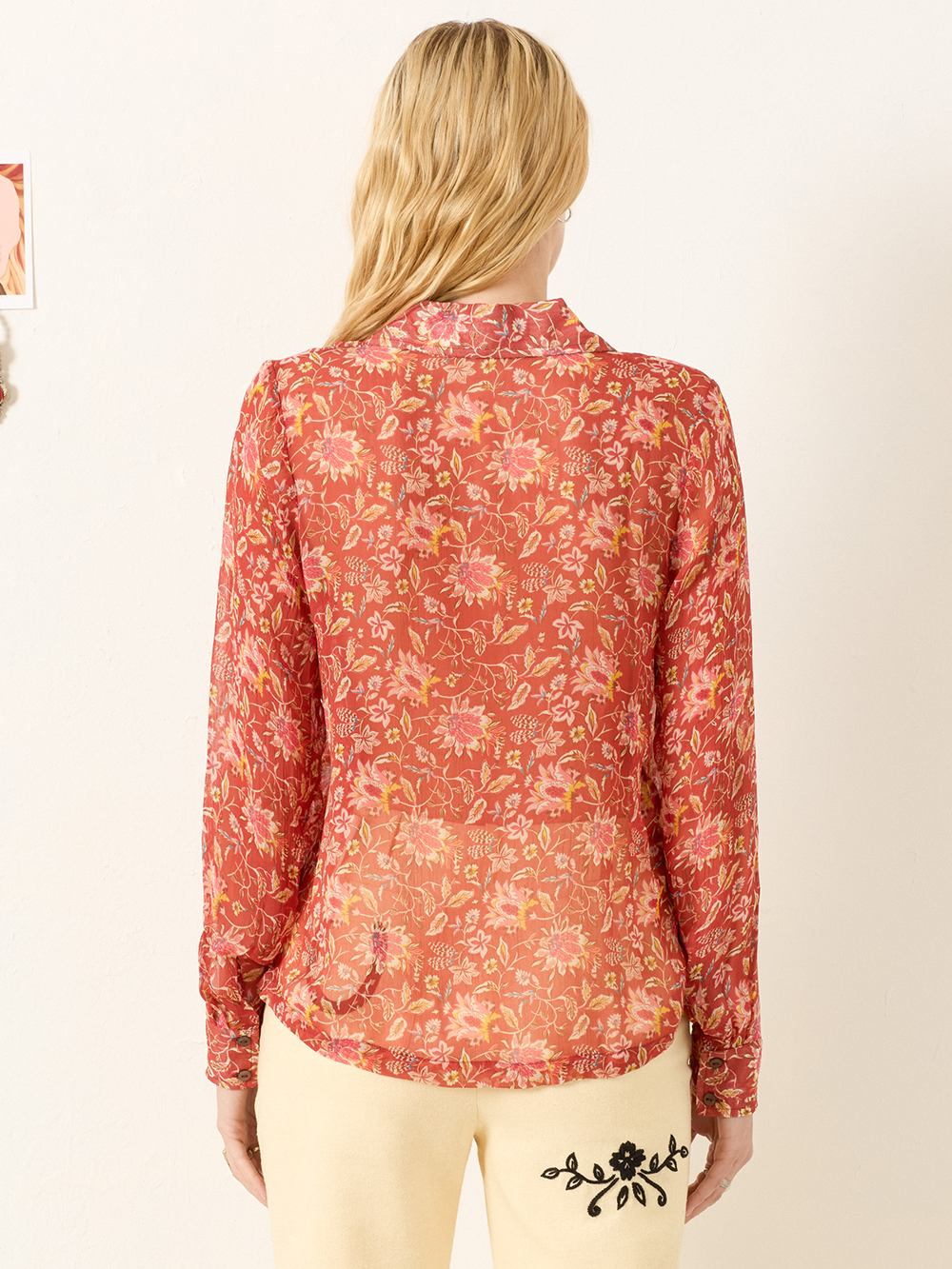 Dolly Saddle Panel shirt by Alix of Bohemia, crafted from brick-colored silk with a floral print in shades of yellow, blue, and beige. A lightweight, straight-cut shirt that buttons down the front with small mother-of-pearl buttons.