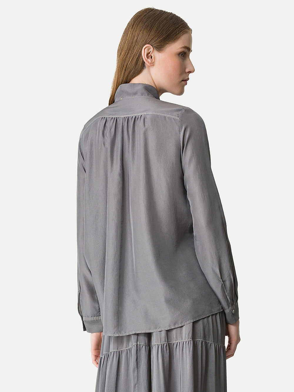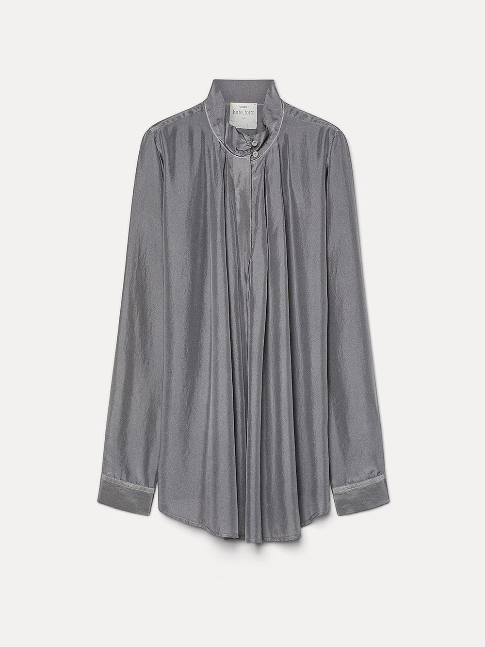 Stone shirt by Forte_Forte, crafted from gray habotai silk. A loose-fitting shirt with a pleated front and button-down funnel collar.