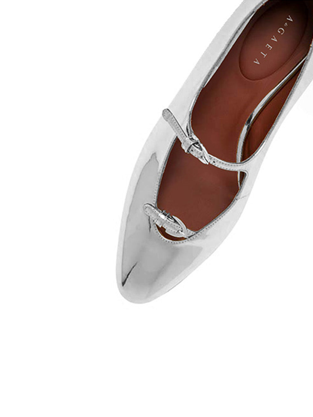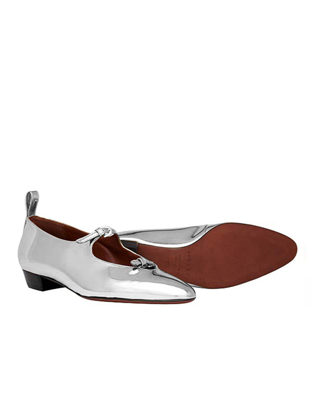 Mary-Jane La Bambola by A Di Gaeta, crafted from silver patent Italian leather. A pair of ballet flats with three adjustable straps, including a removable ankle strap.