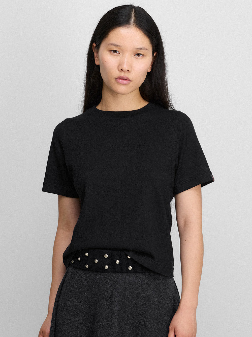 No. 267 Tina Top by Extreme Cashmere is made from a dark brown cashmere and cotton blend. It has a straight, cropped fit with short sleeves.