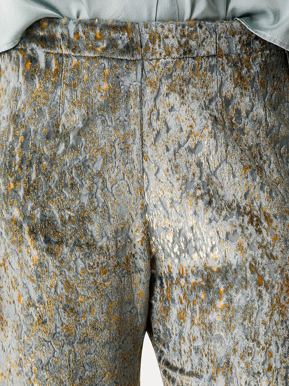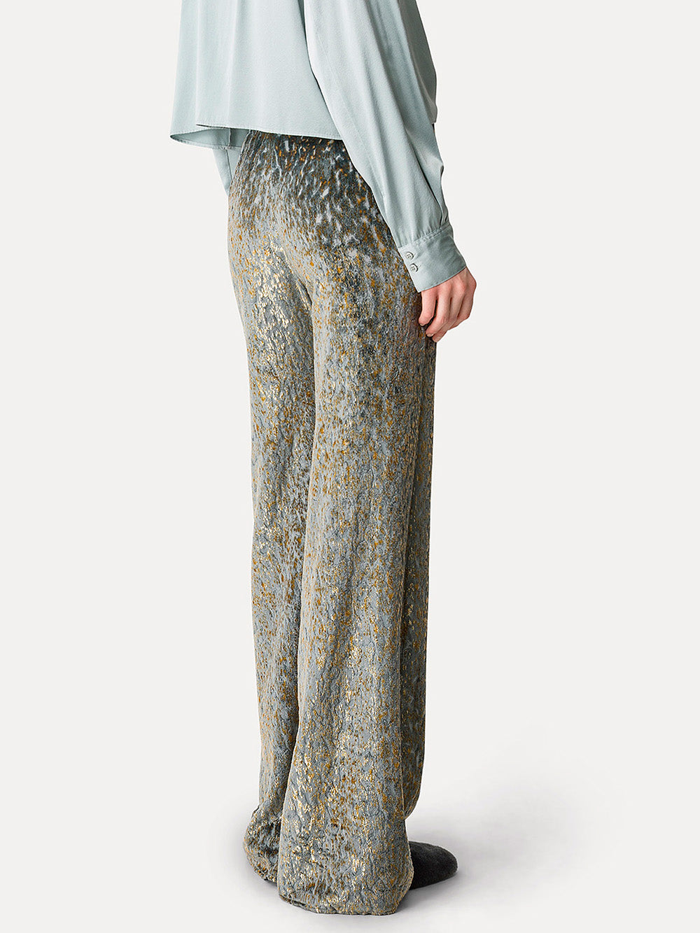 Pantalon Velours en Rêve signé Forte_Forte. Une pantalon à la coupe large et droite confectionné dans un tissu irisé dans les reflets bleu ciel et vert d'eau.
