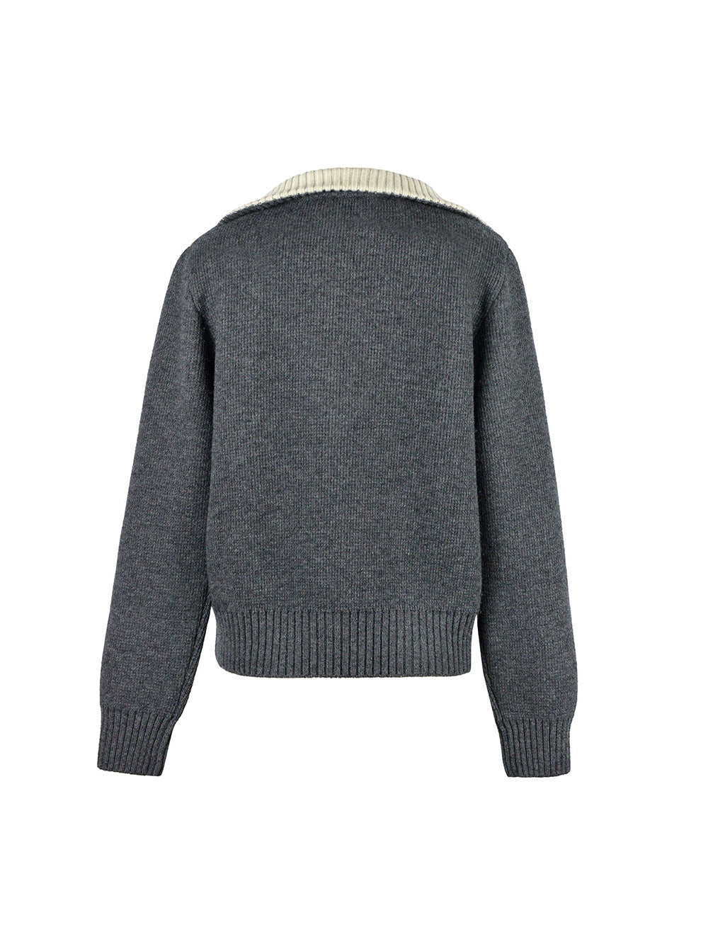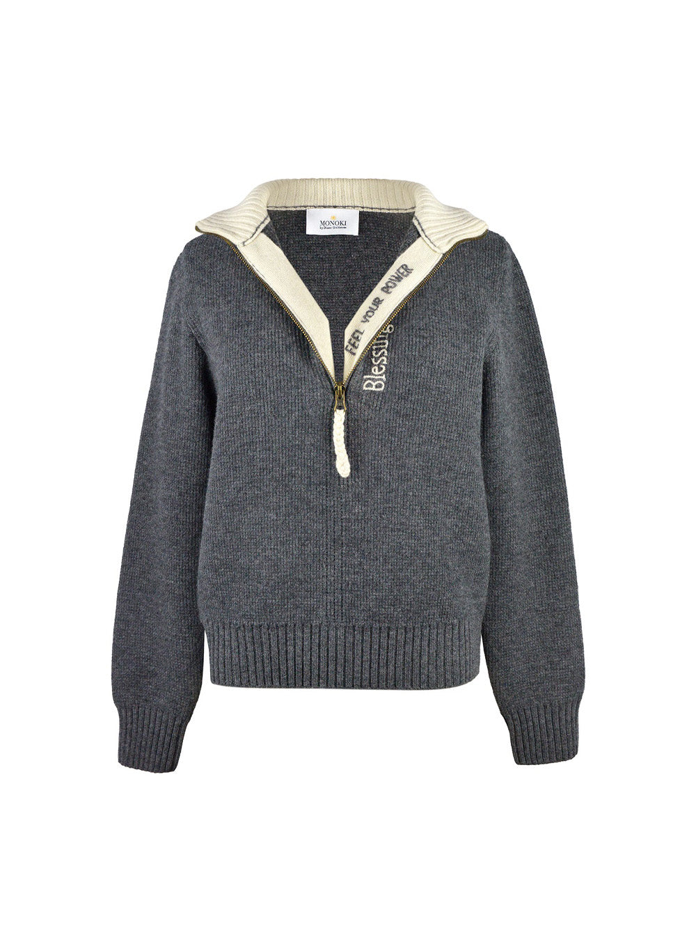Monoki's Truck sweater is crafted from heather gray cashmere. A sweater with a contrasting off-white zipped collar embroidered with the words "feel the power." A trendy piece.