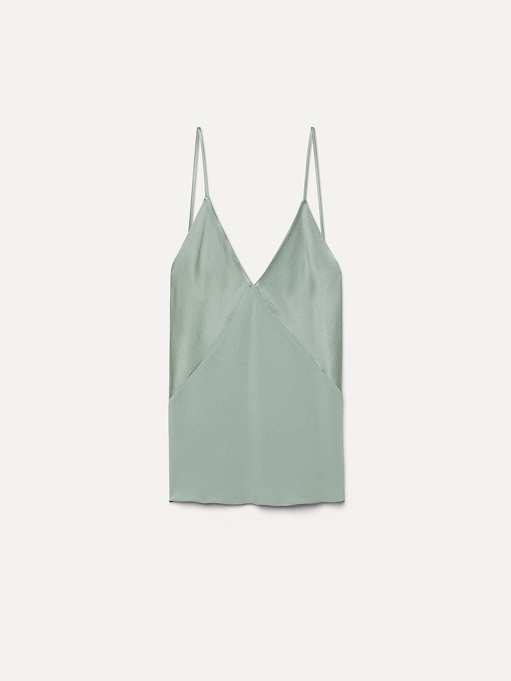 Lichene camisole by Forte_Forte, crafted from sage green satin fabric. A top with thin straps and a V-neckline. A contrasting top between matte and shiny with a satin underside.