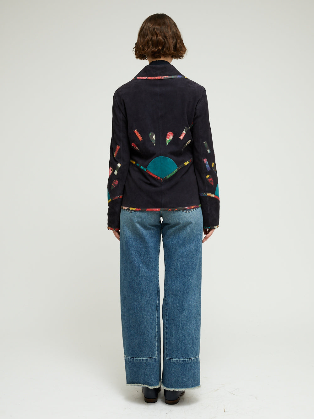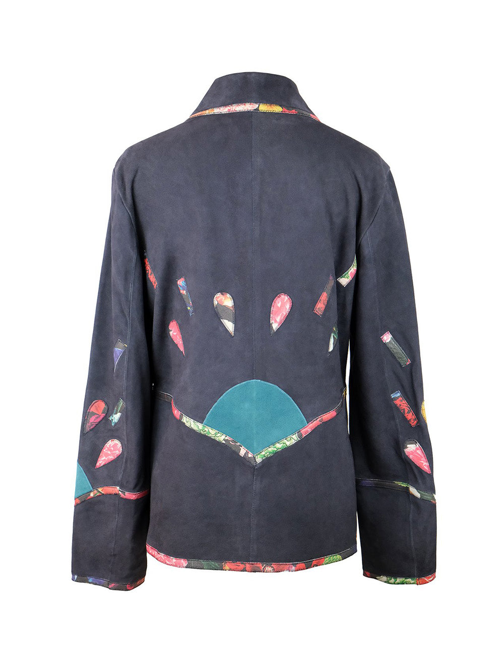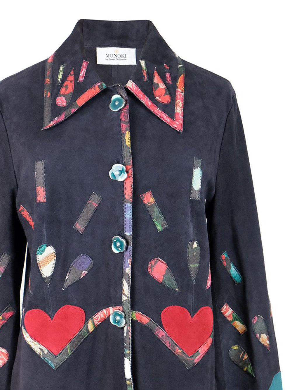 The Dylan Jacket signed Monoki is handmade in navy-colored suede calfskin. The brand's iconic colorful embroidery adorns the front and back of the jacket. It has a fitted cut, a shirt collar and flower-shaped buttons. Available in XS-S or ML.