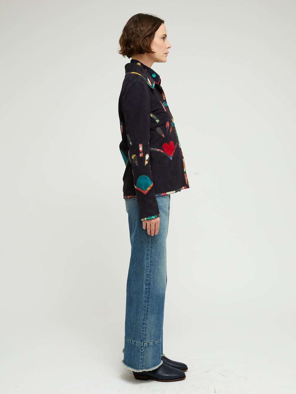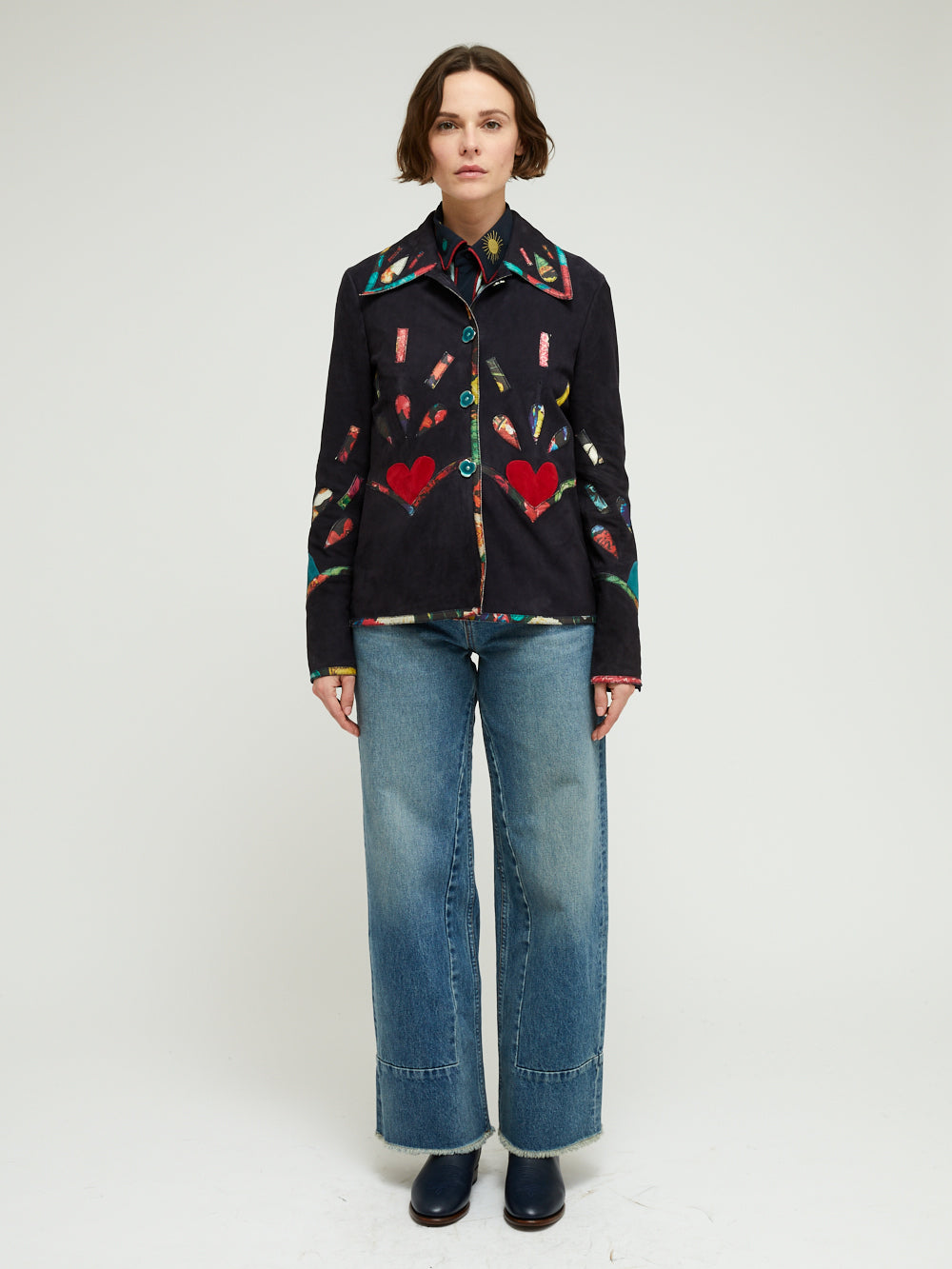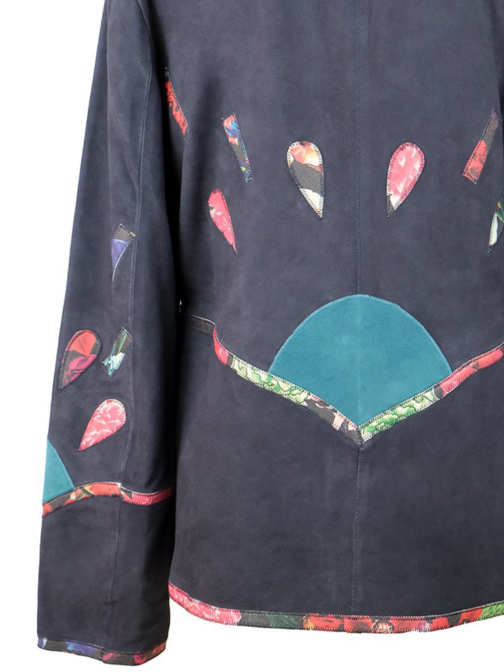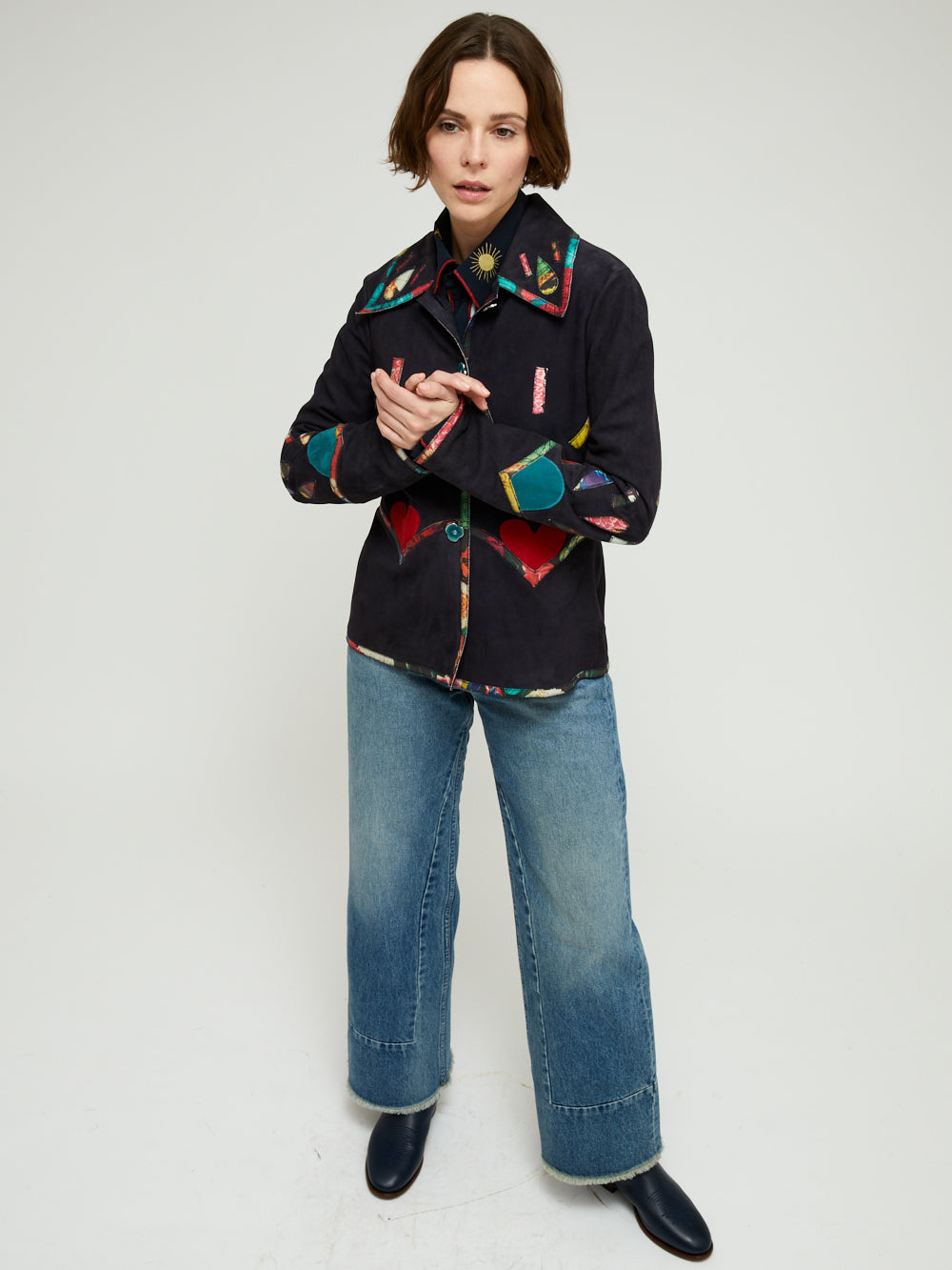 The Dylan Jacket signed Monoki is handmade in navy-colored suede calfskin. The brand's iconic colorful embroidery adorns the front and back of the jacket. It has a fitted cut, a shirt collar and flower-shaped buttons. Available in XS-S or ML.