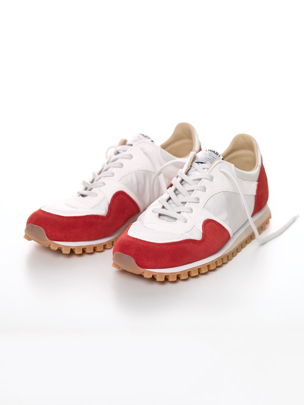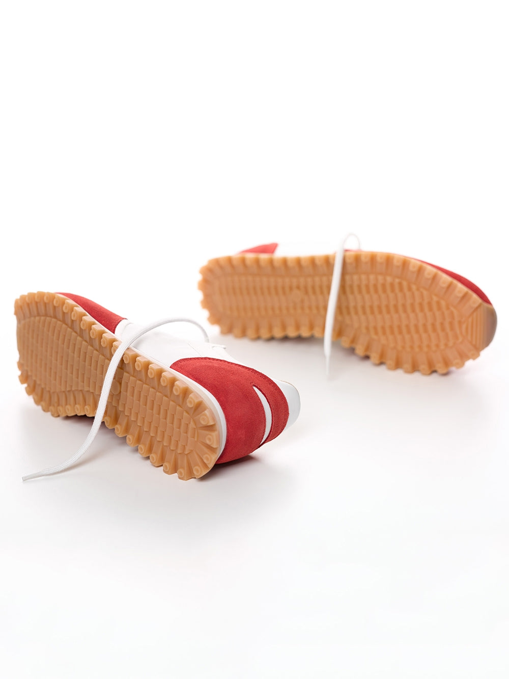 Marathon Trail Low Red Spalwart. These low-top sneakers in white nylon and red suede leather have a round toe and close with white laces. The Spalwart logo is woven into the padded tongue. The sneakers are lined in leather and the soles are lugged in natural rubber.