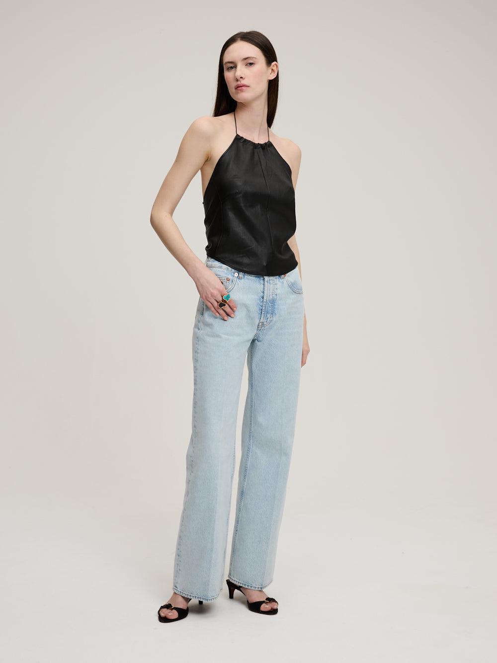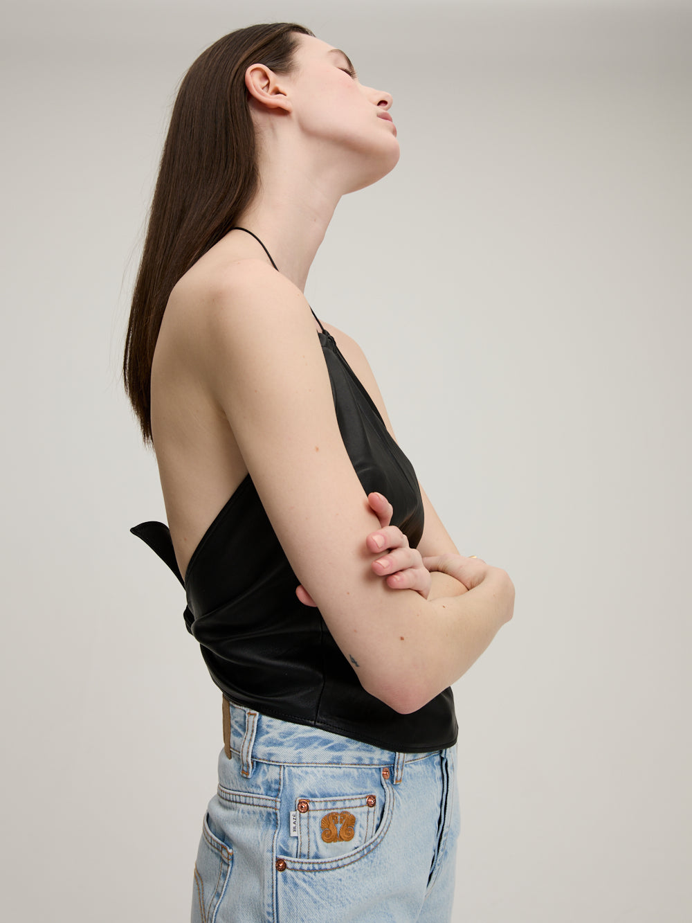 The Rosie top by Stouls is made of black lambskin. It's a halter top tied at the back of the neck and back.