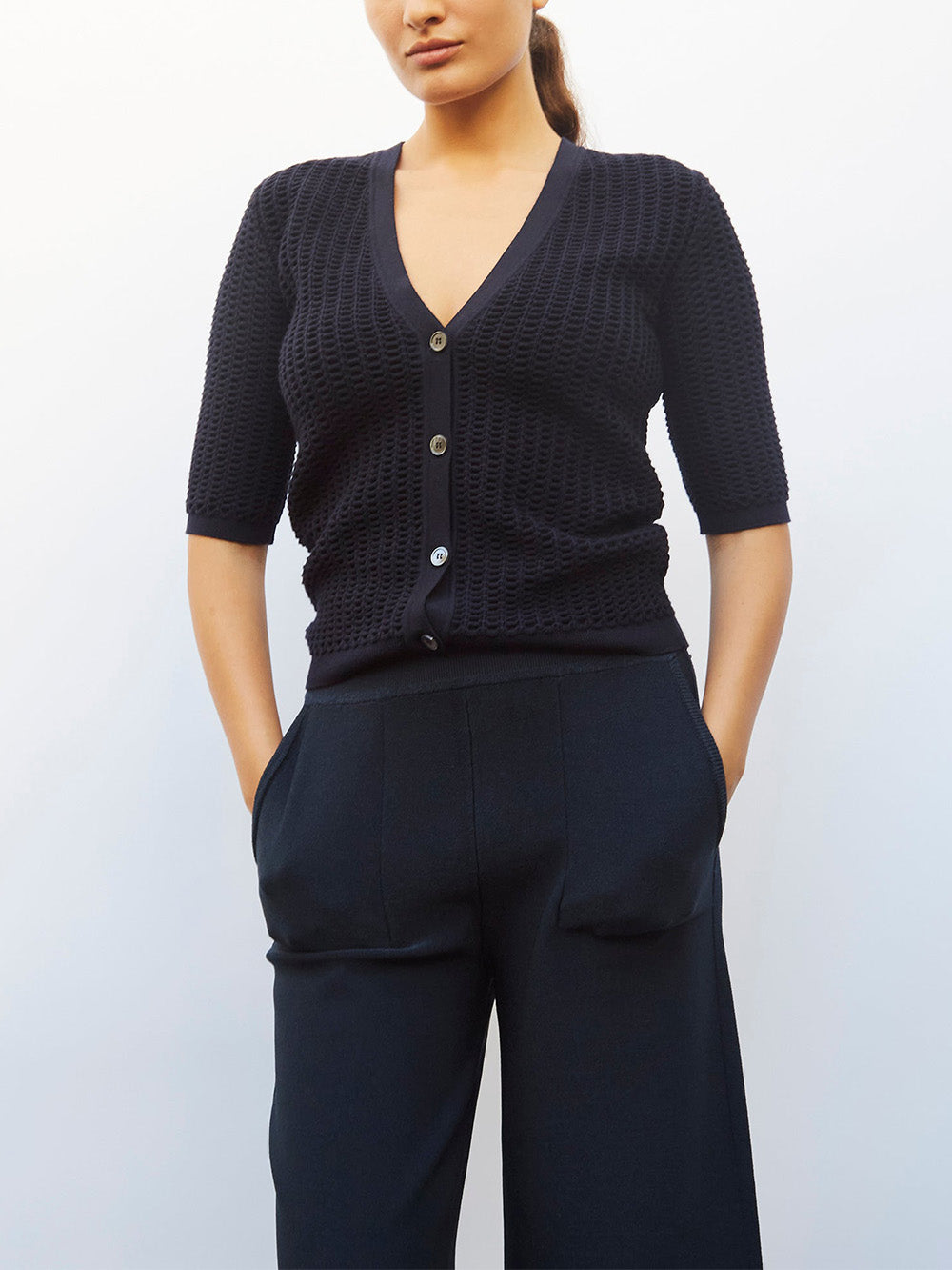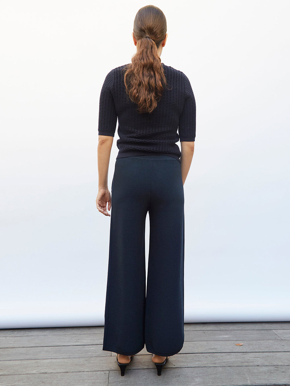 Pantalon Azuro signé Molli tricoté en Italie dans un fil de viscose stretch bleu nuit. Un pantalon à jambes larges et taille haute.