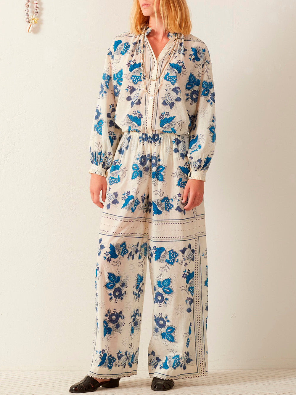 The Margie Blue China pants are made by Alix of Bohemia. Handmade in an ecru cotton with a blue floral print, it has a straight, full cut and an elastic waist.