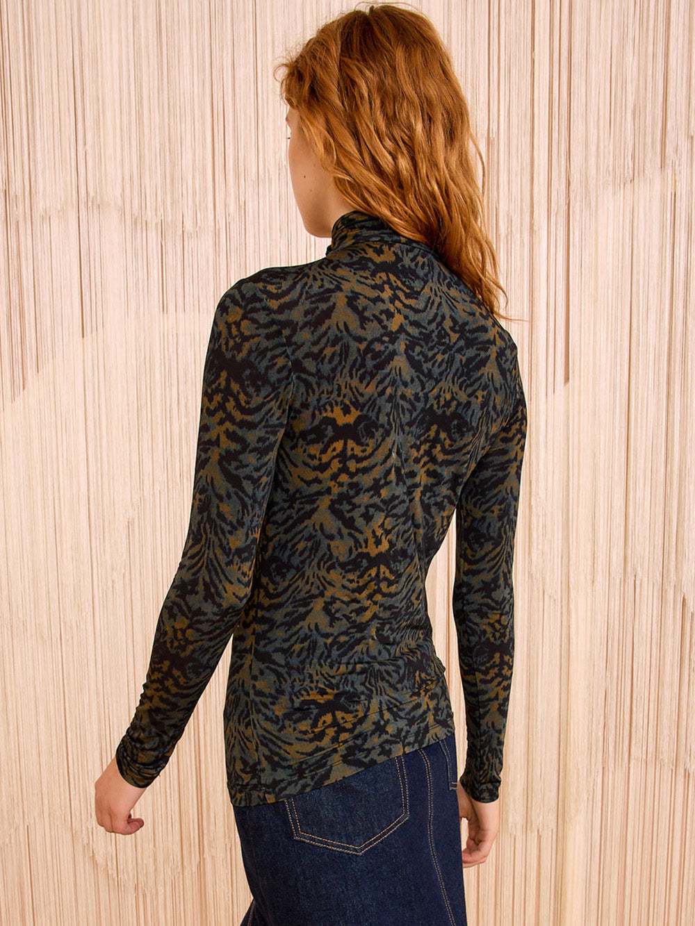- Prints in mustard, khaki and forest green tones