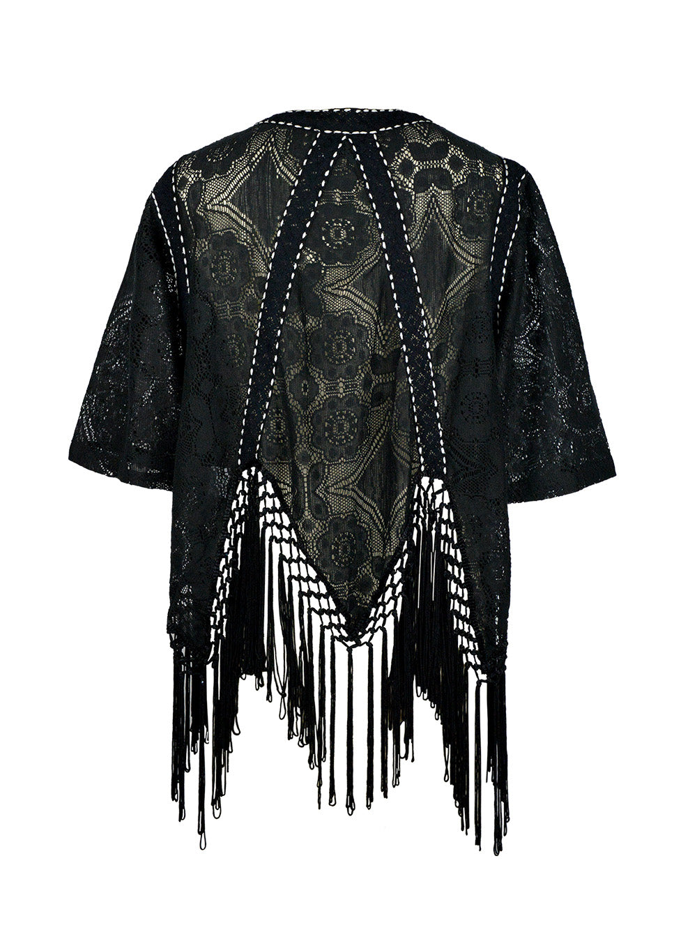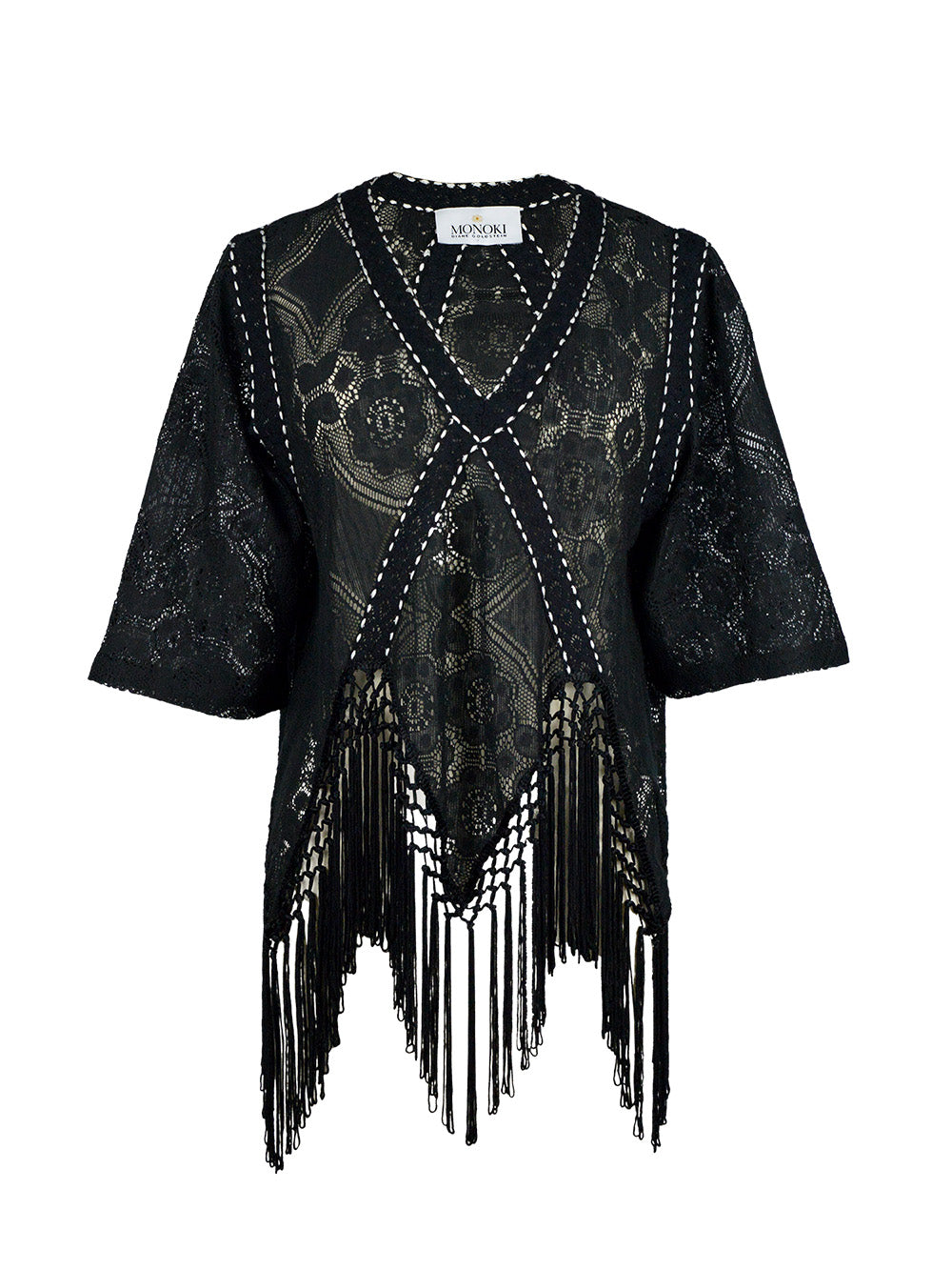Spotlight top by Monoki, crafted from black lace cotton with black stitching. A bohemian top with hand-tied fringes.