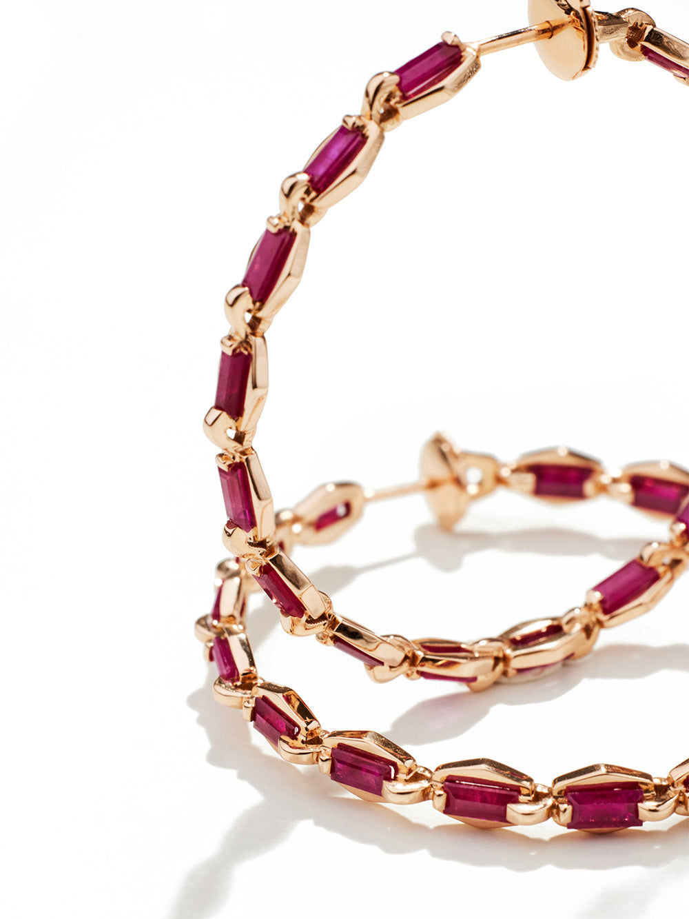 Desire XL earrings by Lito Crafted in 14-karat and 18-karat rose gold set with baguette-cut rubies. A design inspired by jewelry chains.