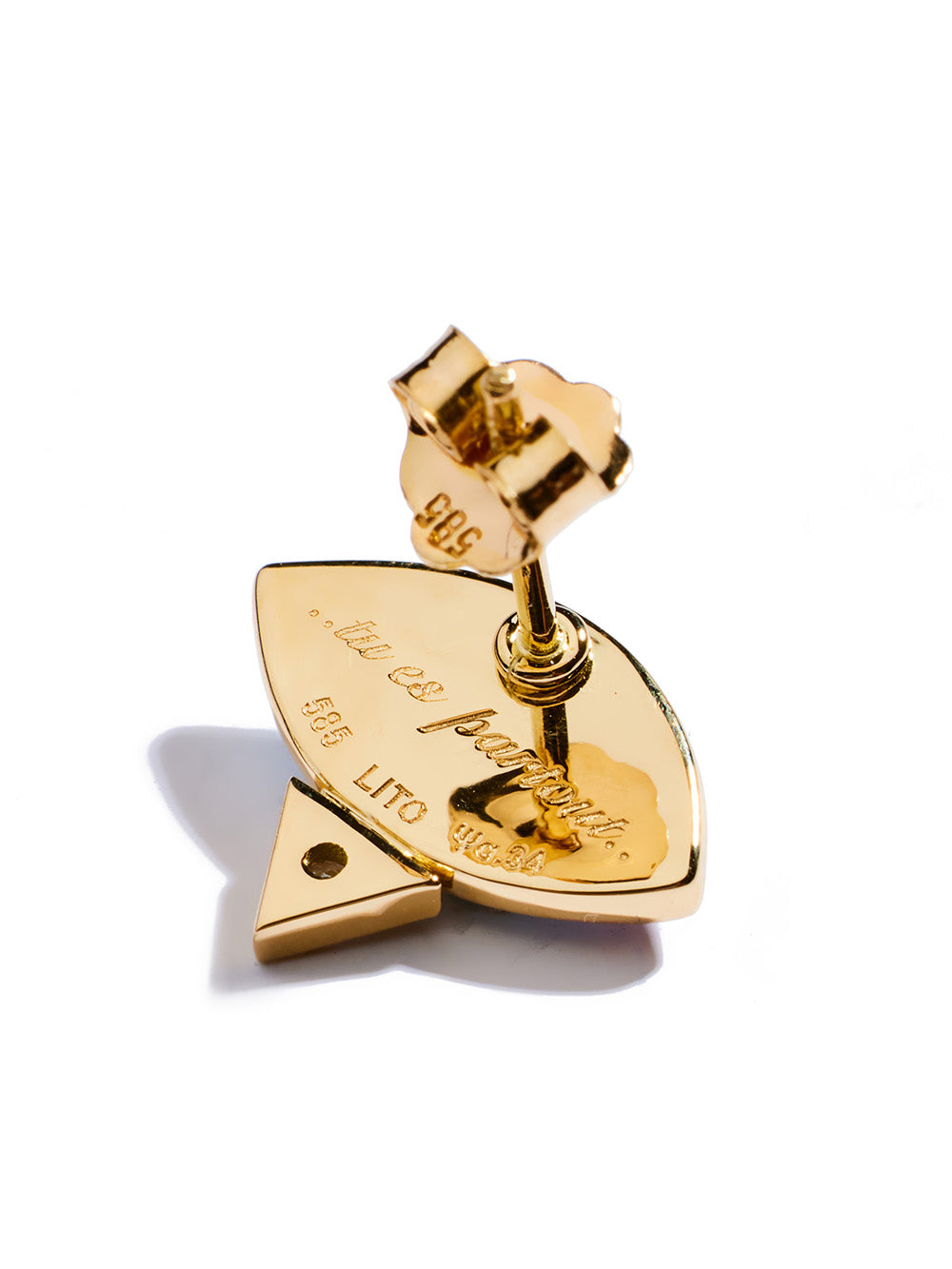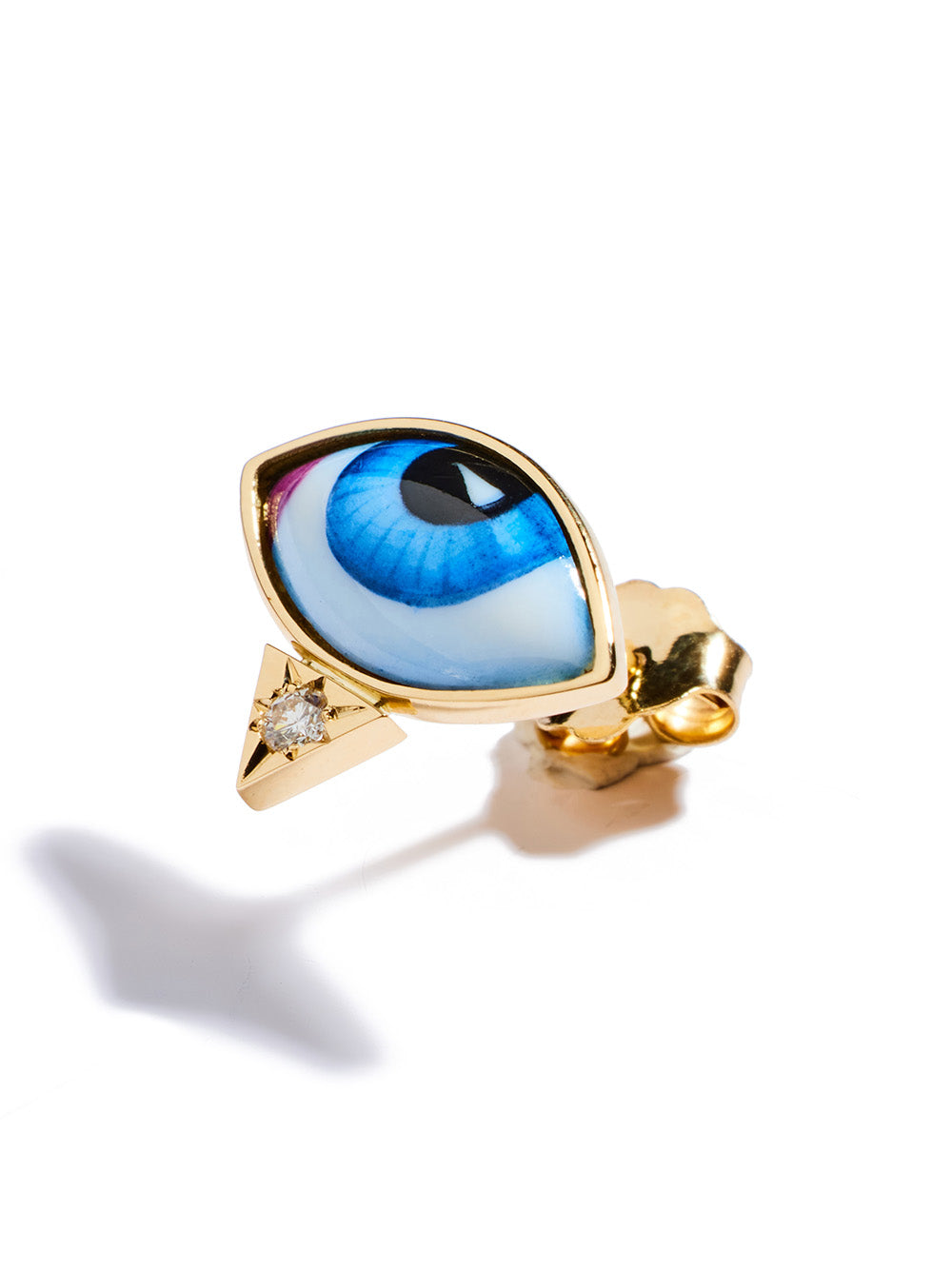 Petit Bleu earring by Lito crafted in 14-carat yellow gold decorated with enamel depicting a blue eye. Decorated with a small brilliant-cut diamond at the end.