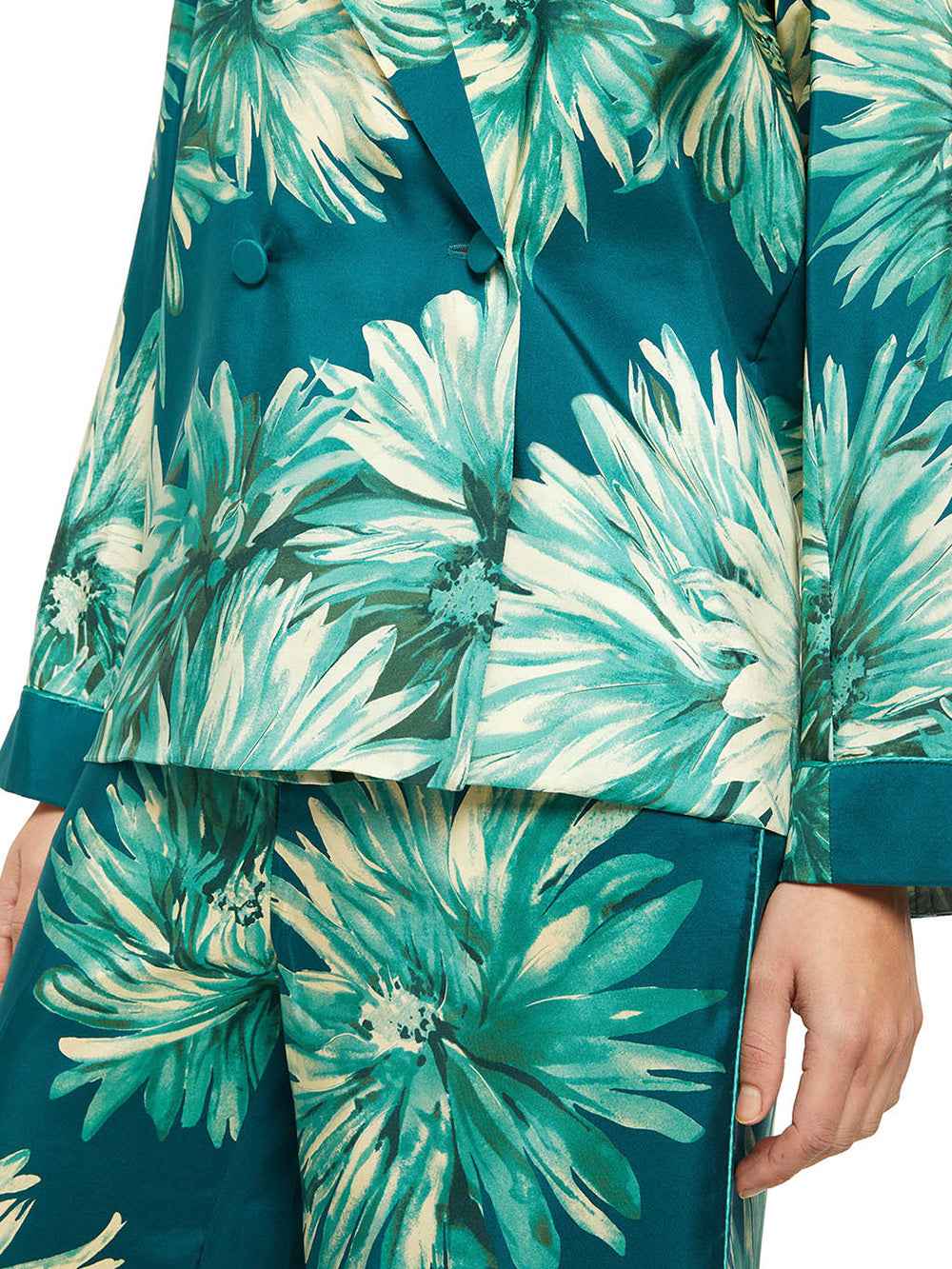 Otrera Dahlia Green Shirt by For Restless Sleepers, crafted from emerald green habotai silk printed with green dahlias. A double-breasted, blazer-style shirt.