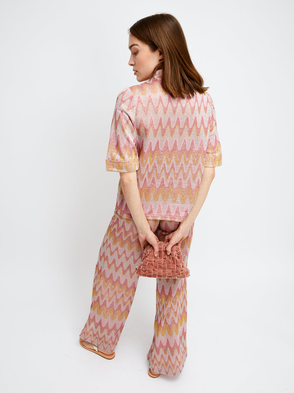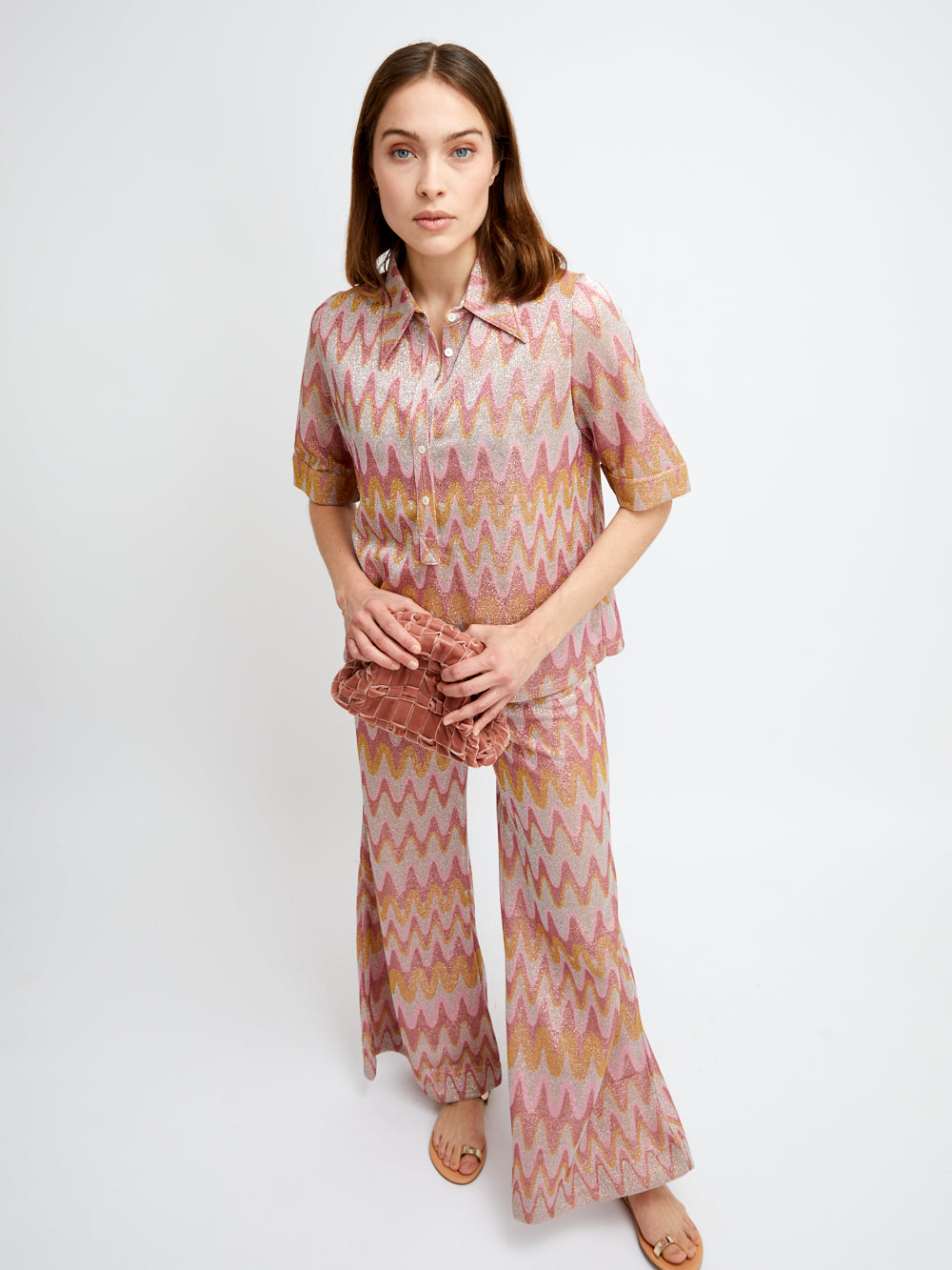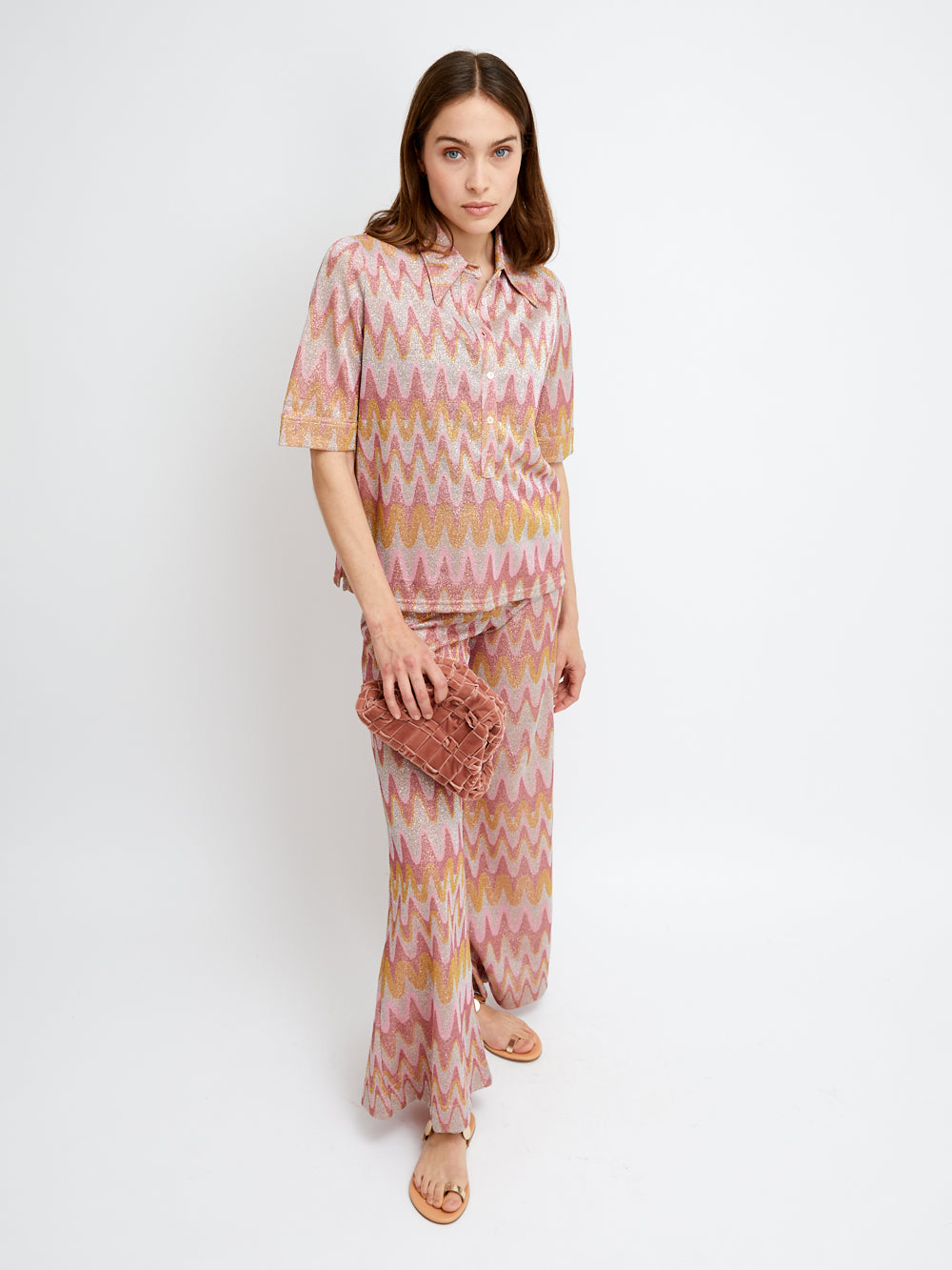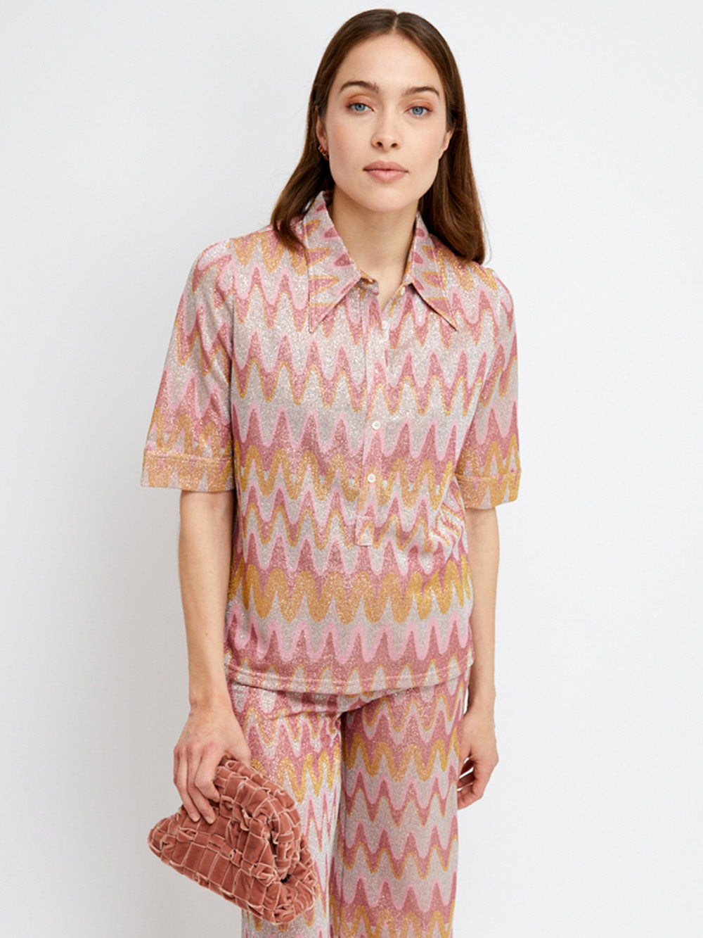 Lauren Vague Rose shirt by La Prestic Ouiston, crafted from jersey and pink, gold, and silver lurex. Polo-style cut with mid-length sleeves.