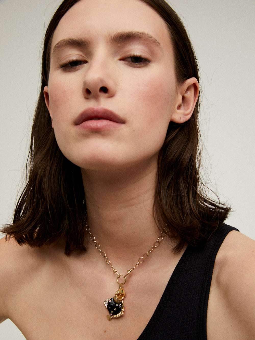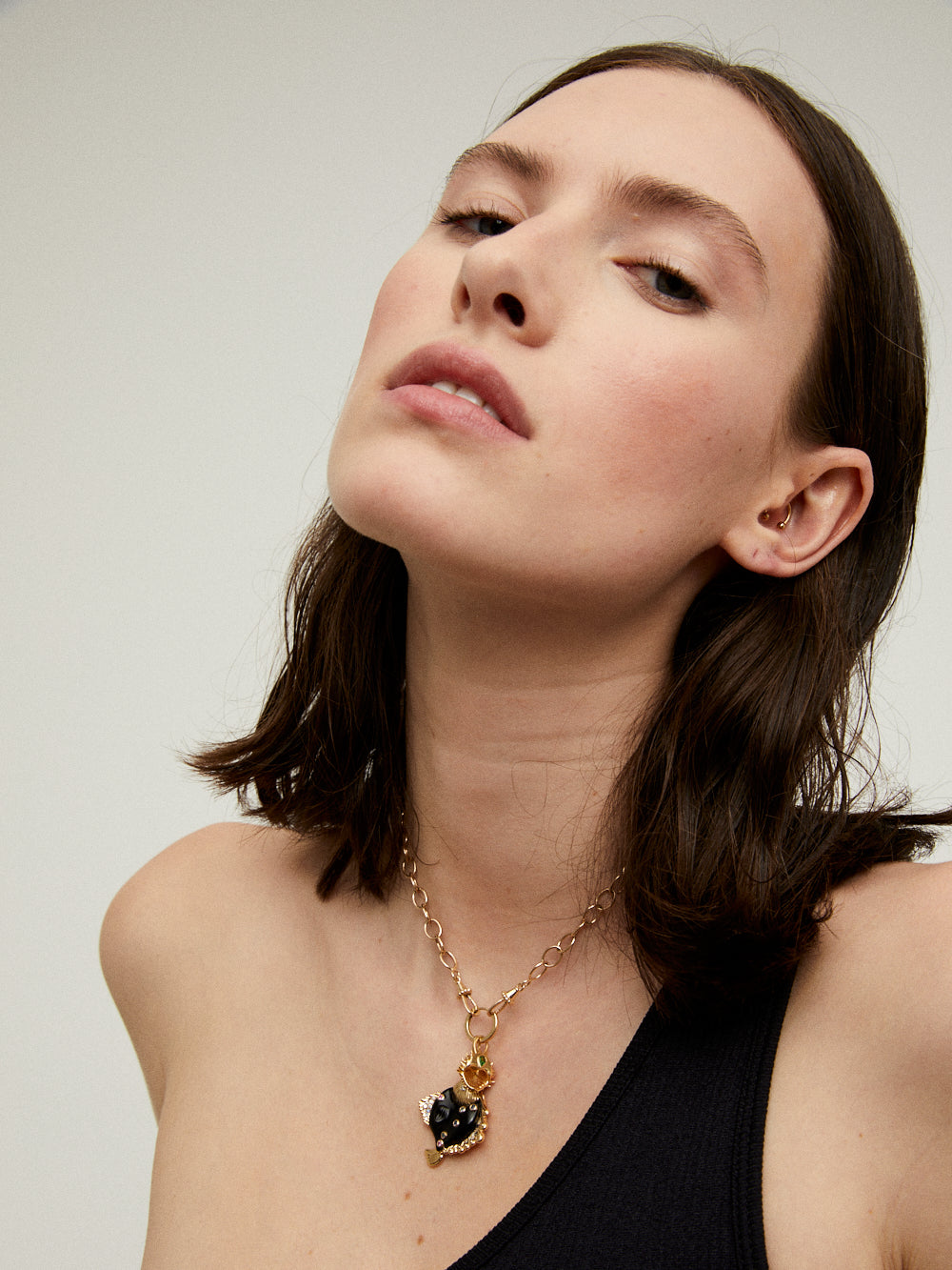 Robono Macchiato pendant by Maruccia made of black jade enhanced with randomly arranged colored sapphires. Sculpted fins and head as well as an articulated tail.