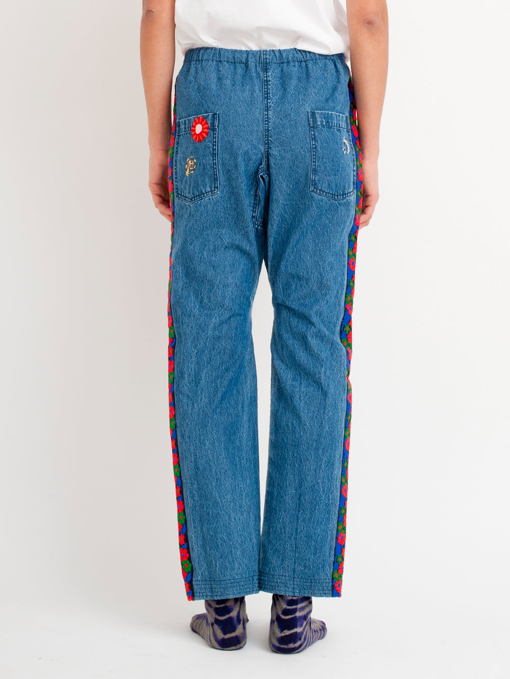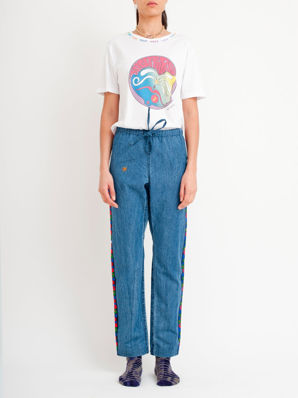 Monoki denim trousers. These loose-fitting trousers in blue denim have silk printed stripes on the sides and are adorned with fine embroideries and patches. The model has three pockets, an elastic waistband and a drawstring to tie. One size.