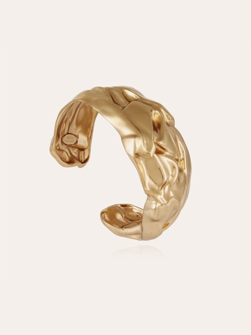 Compression Gold Bracelet by Gas Bijoux made of compressed gold metal taking the appearance of a crumpled sheet covered in gold. A cuff-style bracelet.