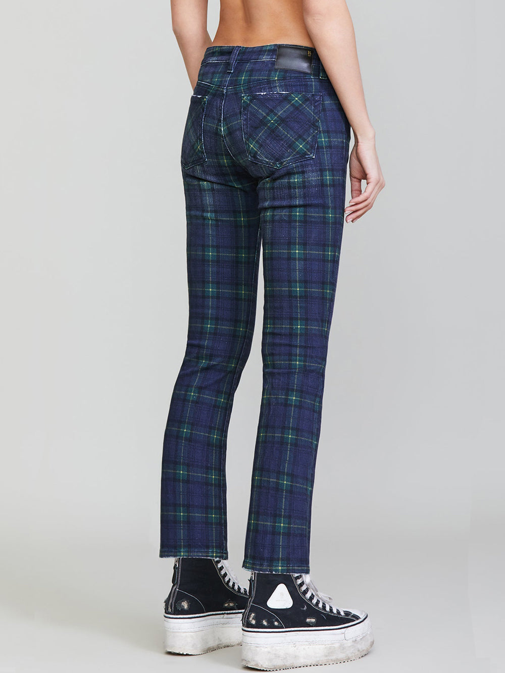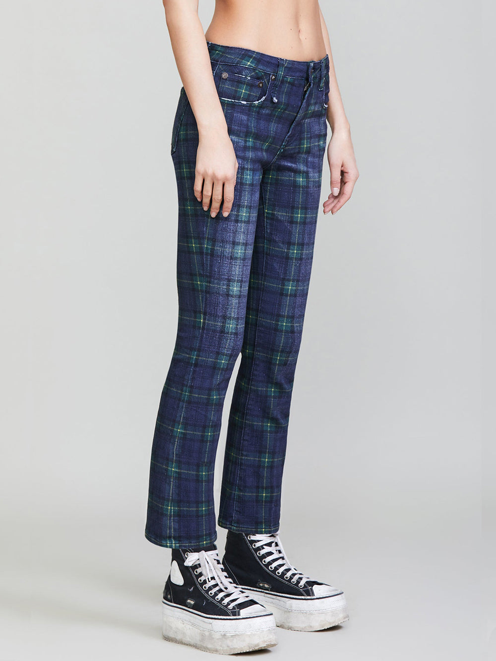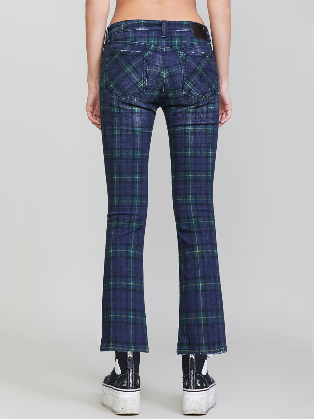 R13 Kick Fit Jeans. These jeans have a tartan print and are made from a stretchy fabric. This product has a flared cut and a mid-rise waist, and has belt loops and five pockets.