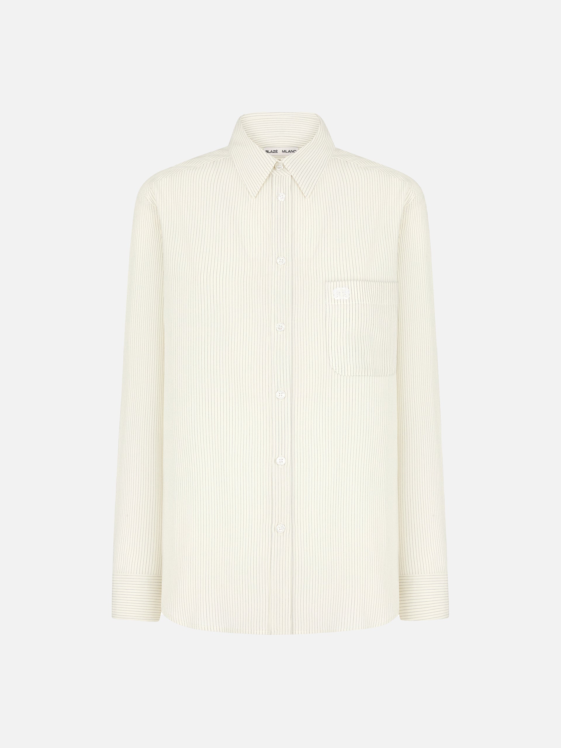 Anabas Kris shirt by Blazé Milano, crafted from off-white silk with navy blue stripes. A straight-cut shirt with a patch pocket on the chest.