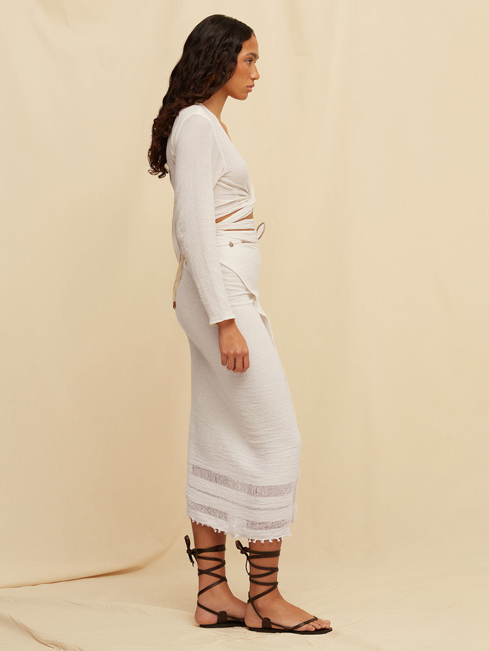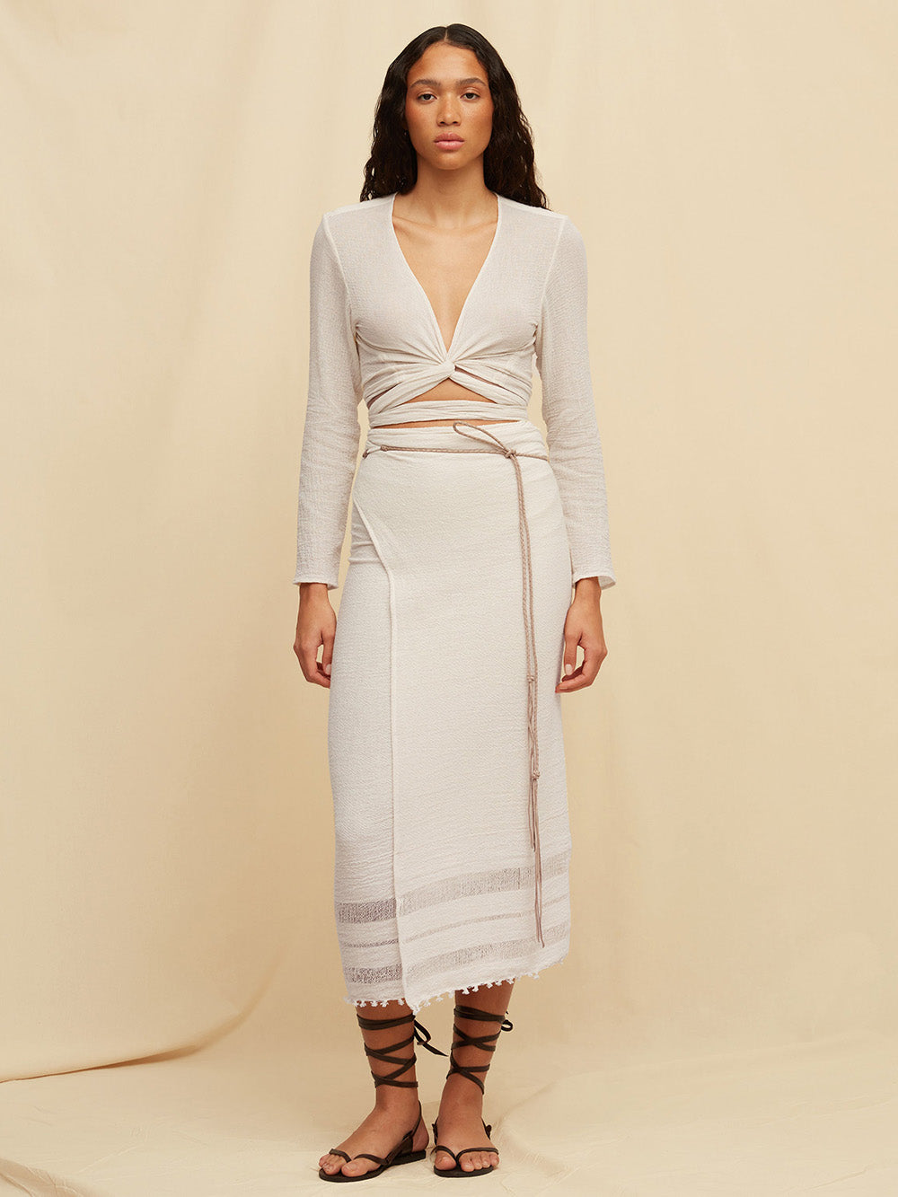 Natural Wrap Pareo by Caravana, made from off-white cotton. A midi-length wrap-style pareo decorated with embroidered bows at the hem.
