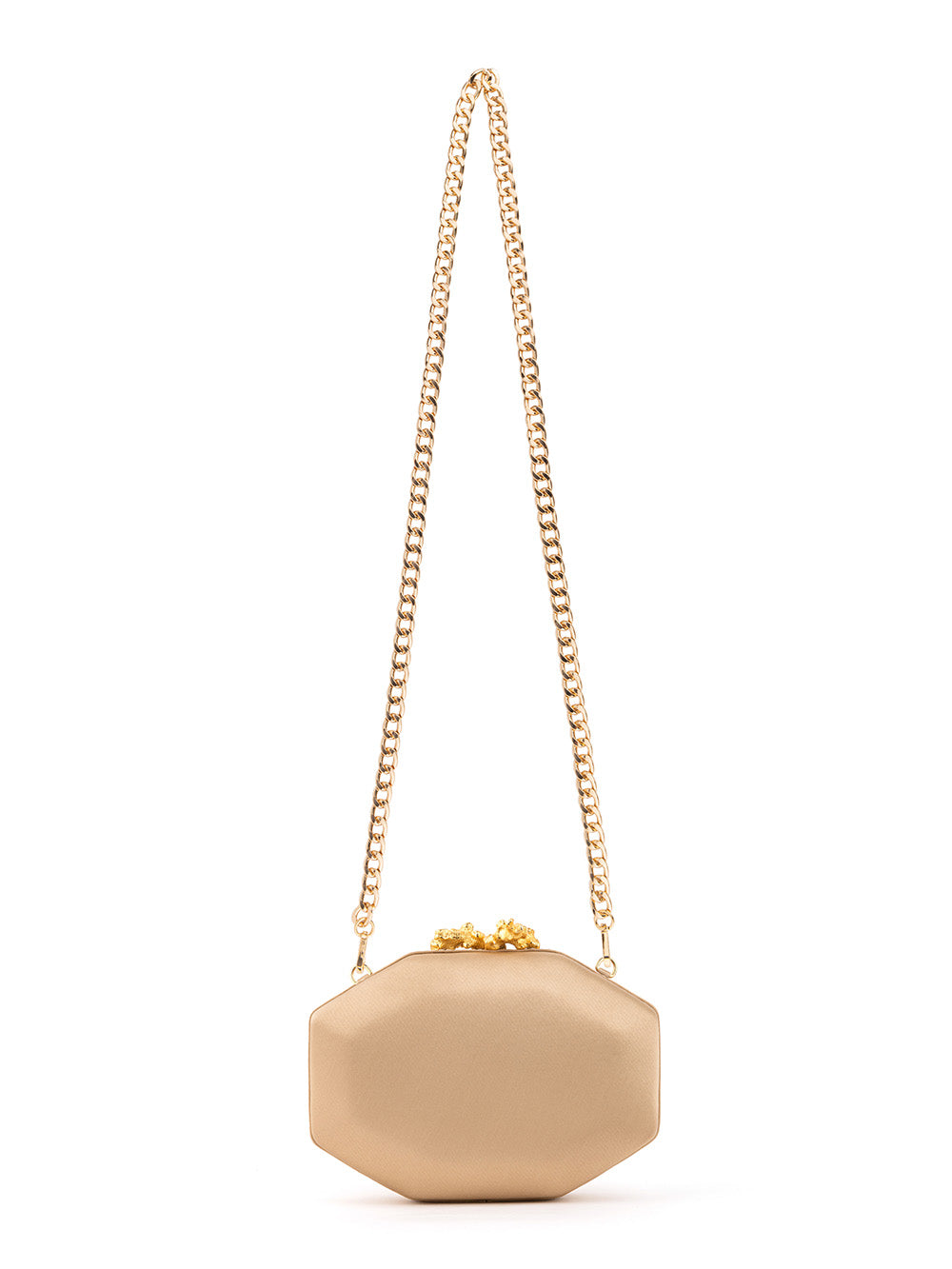 Uriel Terre pouch by Gustoko made from beige satin fabric. A hexagon-shaped pouch with magnetic opening.