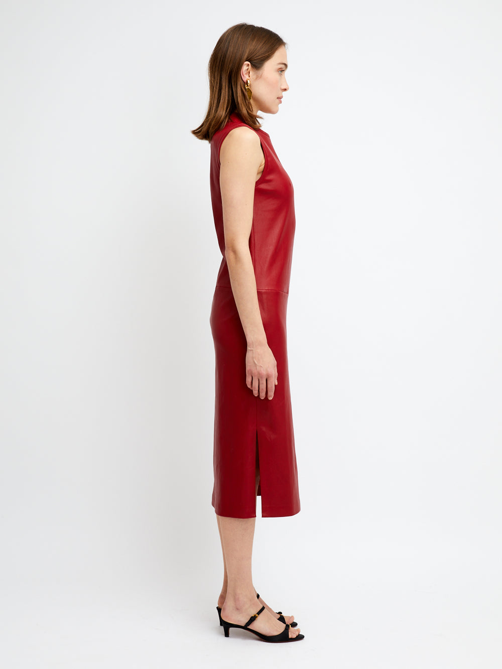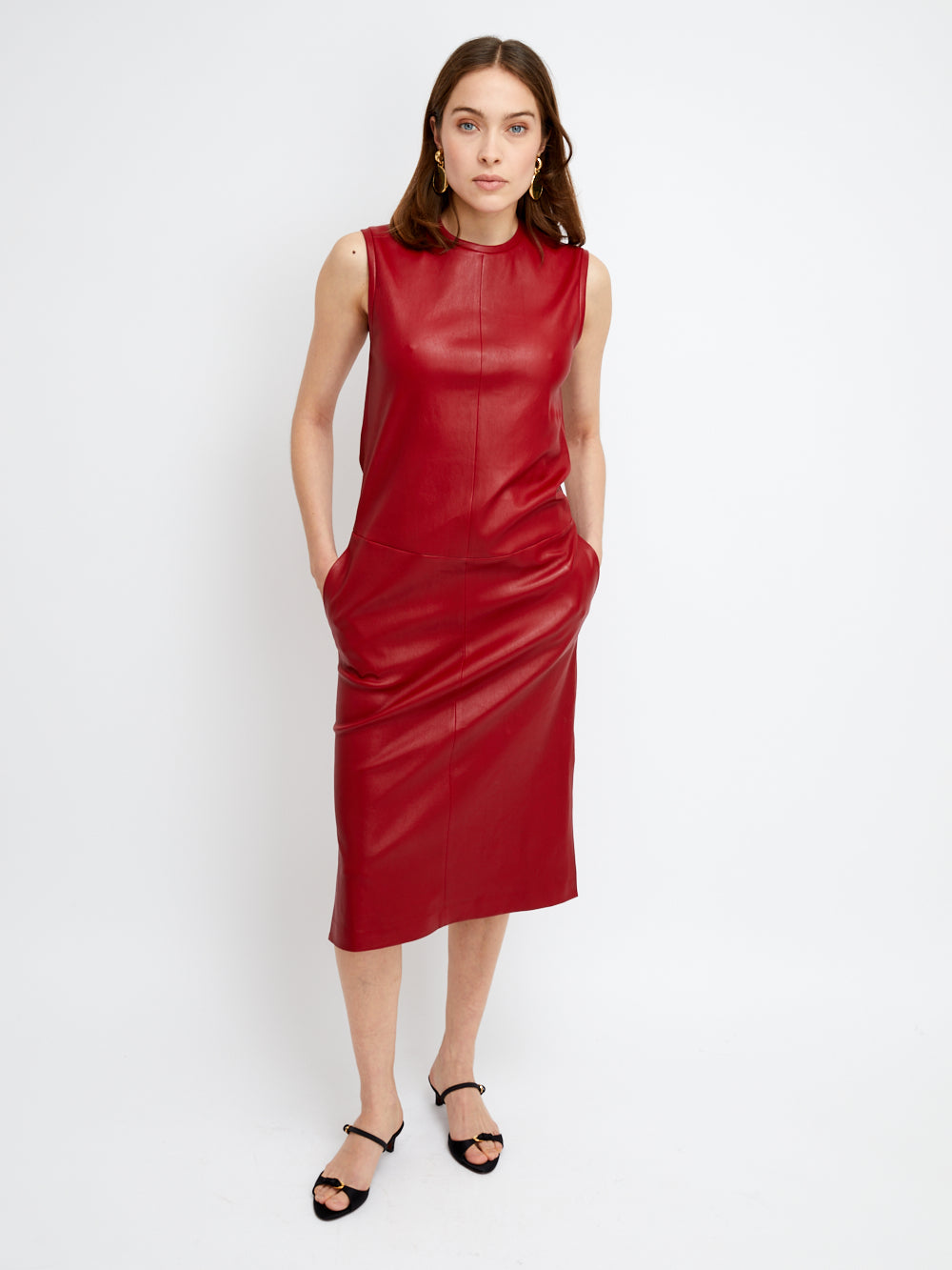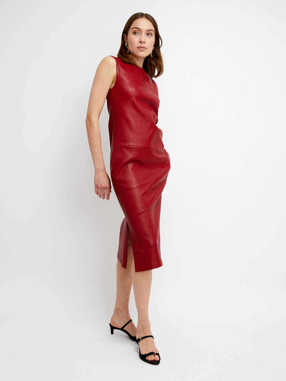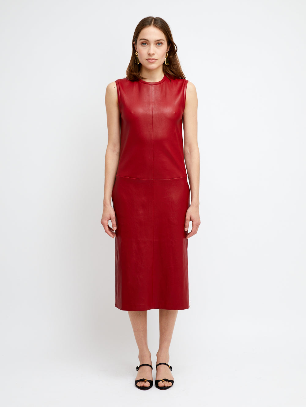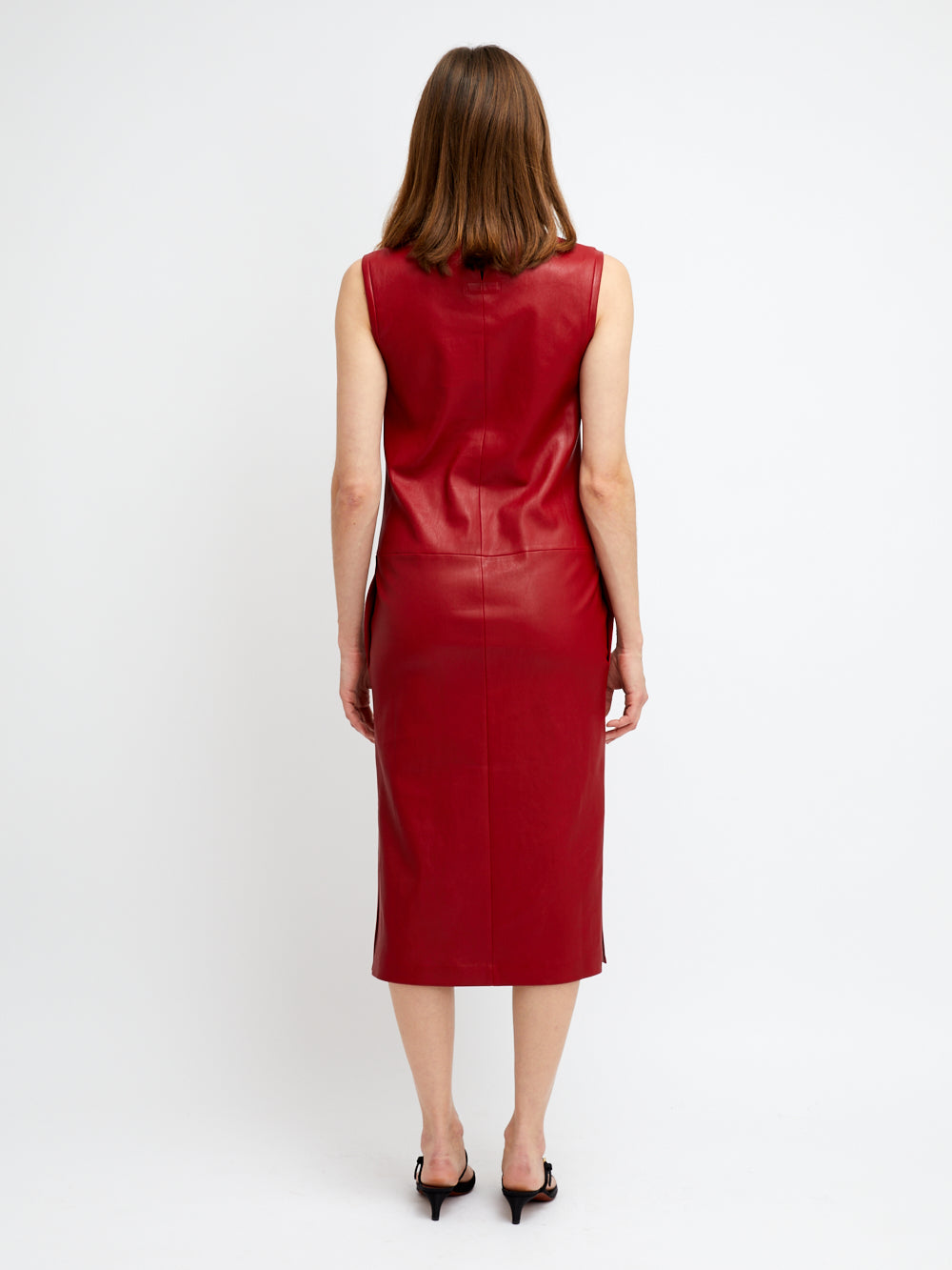 Caro Bindi dress by Stouls made from deep red dipped lambskin. A straight-cut dress inspired by the Roaring Twenties.