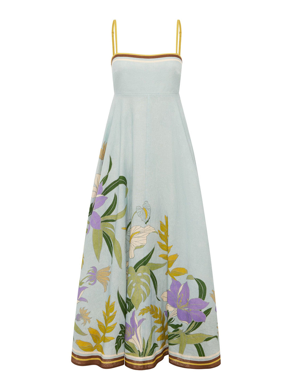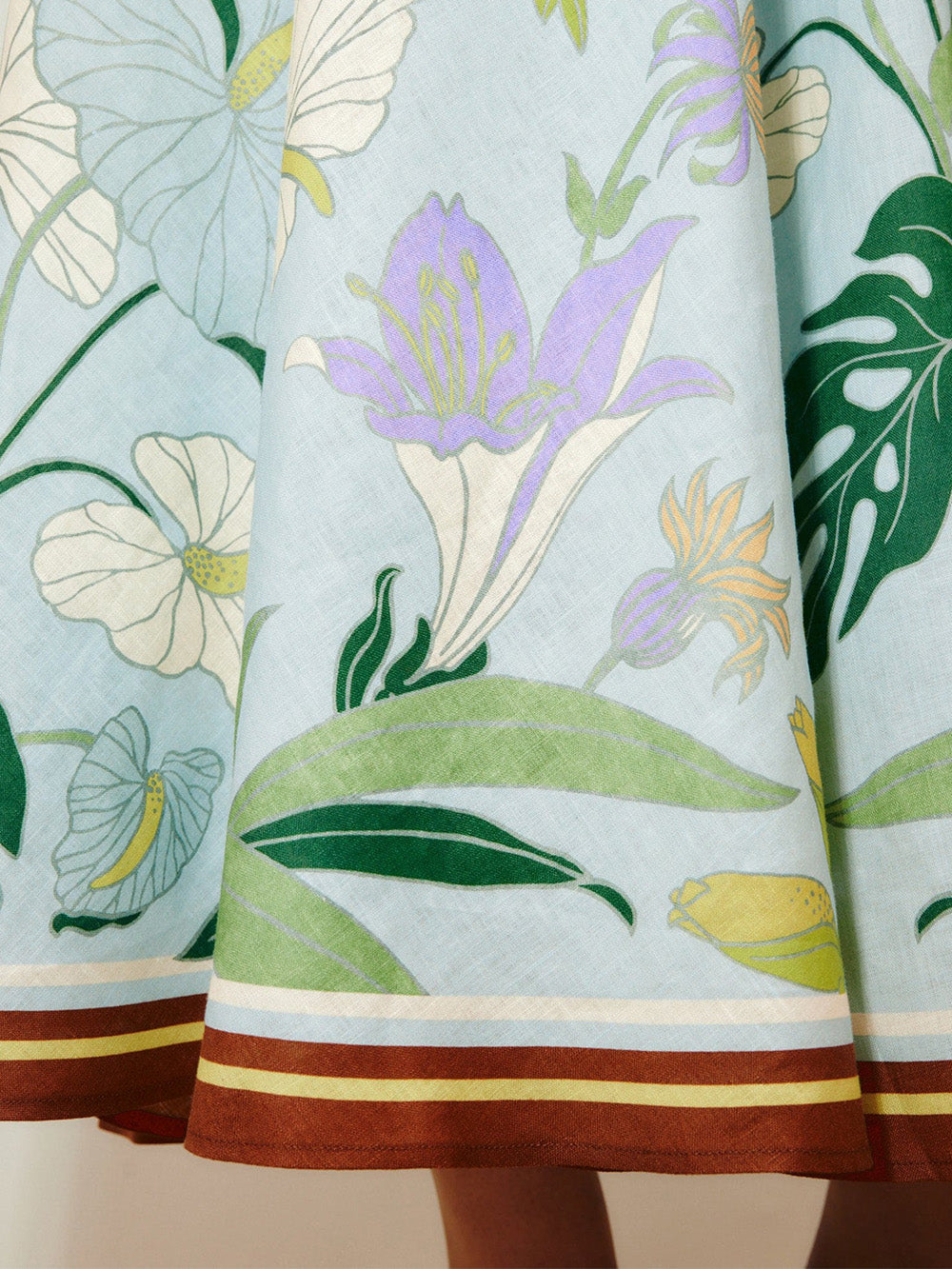 Alfie sundress by Alémais, made from European linen Sky blue in color, printed with flowers in shades of purple, green and white. A flared midi-length dress with an empire bodice.