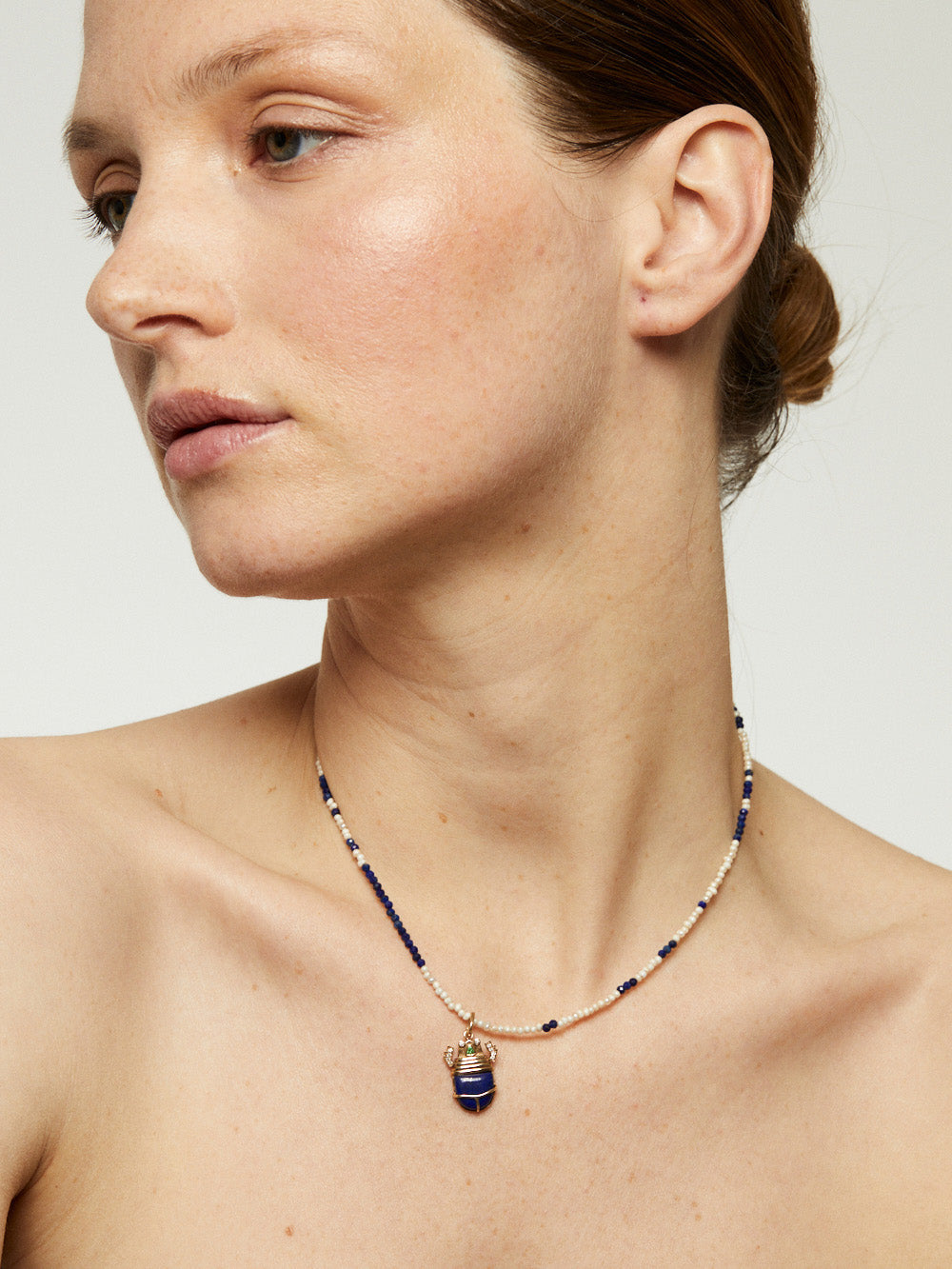 This scarab necklace by Tamara Taichman is made of white freshwater pearls and lapis lazuli. It is decorated with a matching scarab pendant. A piece of jewelry entirely handmade according to the know-how of artisans.