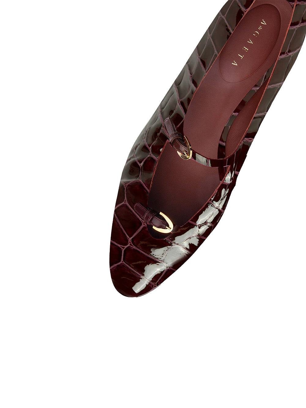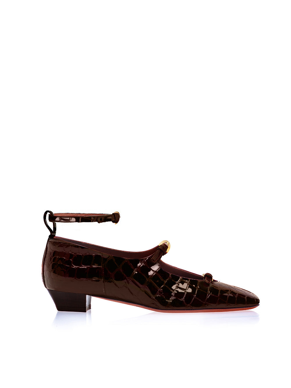 Mary-Jane La Bambola signée A Di Gaeta confectionnée en cuir italien imitation crocodile marron vernis. Une paire de ballerines accompagnée des trois brides ajustables dont une amovible au niveau de la cheville.