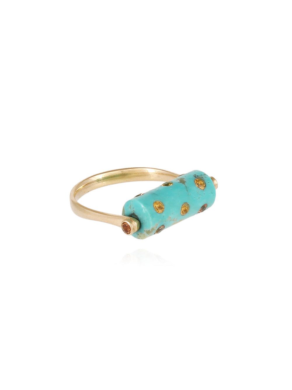 La bague tube Léa de la créatrice Tamara Taichman est réalisée à la main par des artisans. Elle se compose d'un barillet mobile en turquoise, serti de saphirs jaunes, le tout monté sur un anneau en or jaune 14 carats.