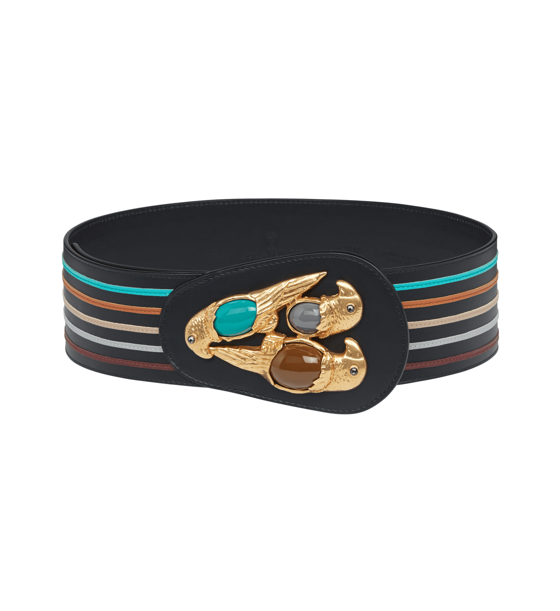 Ceinture Parrot signée Sonia Petroff confectionnée en cuir italien noir sur lequel est appliqué des bandes de cuir colorées. Une boucle oval déstructurée sur laquelle sont apposés trois perroquet recouverts d'or 24 carats de tailles différentes.