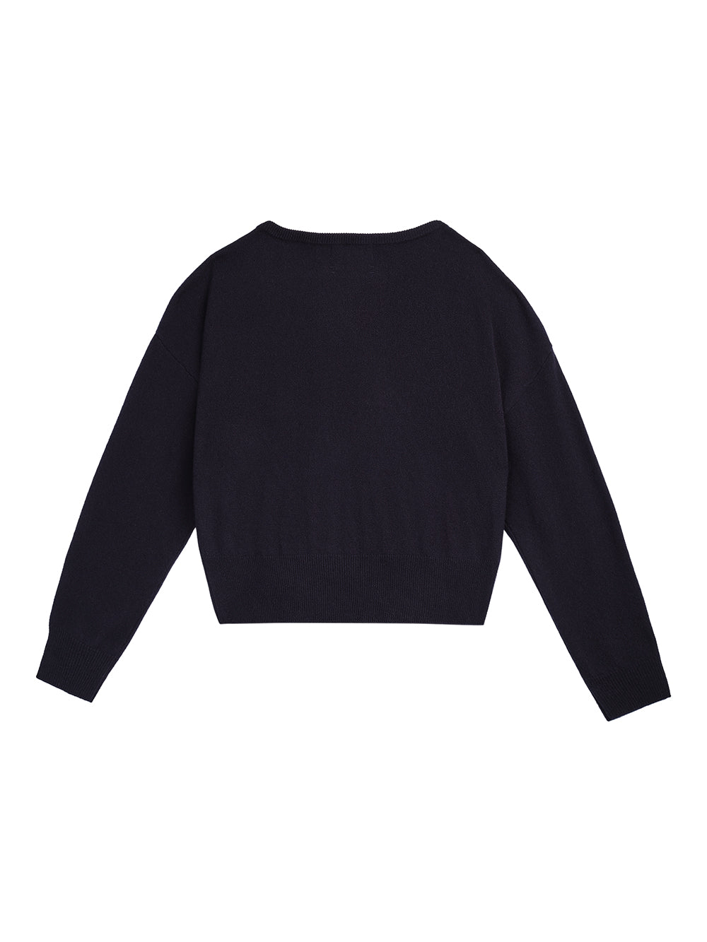 N°402 Pull Debby Desert signé Extreme Cashmere confectionnée de couleur bleu navy. Un pull à la coupe courte et au col bateau avec des manches longues légèrement chauve-souris.