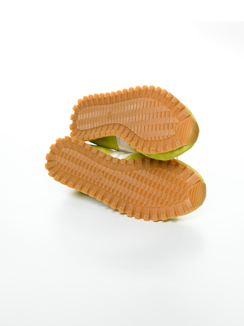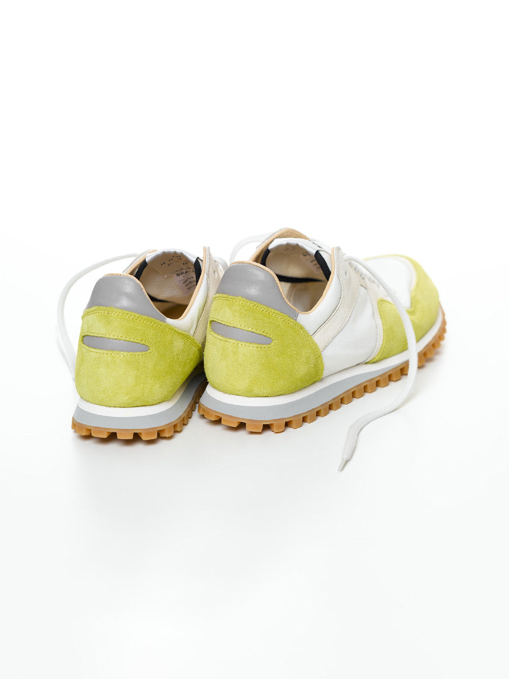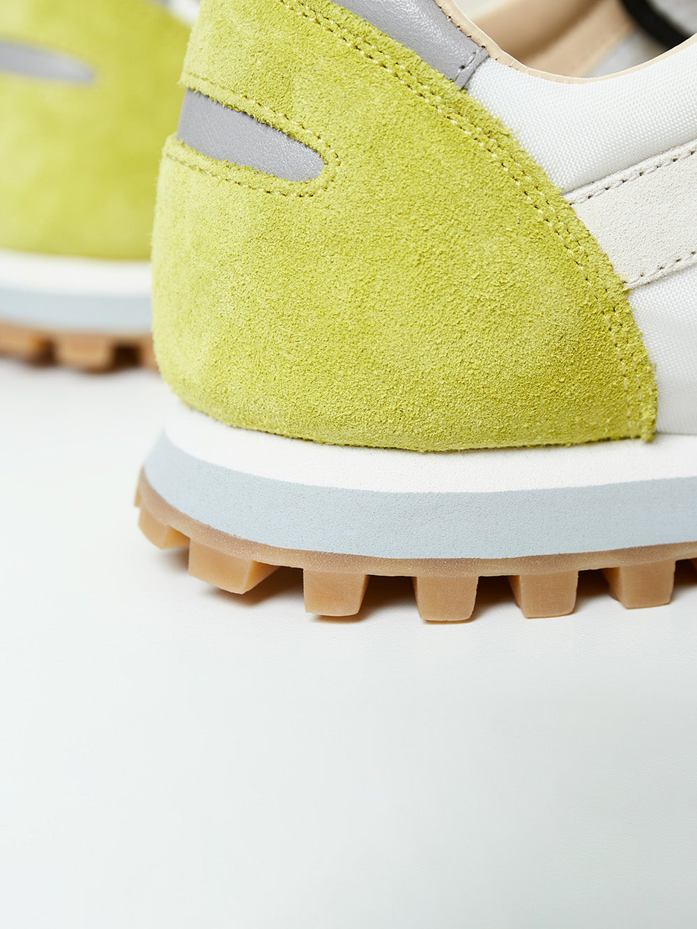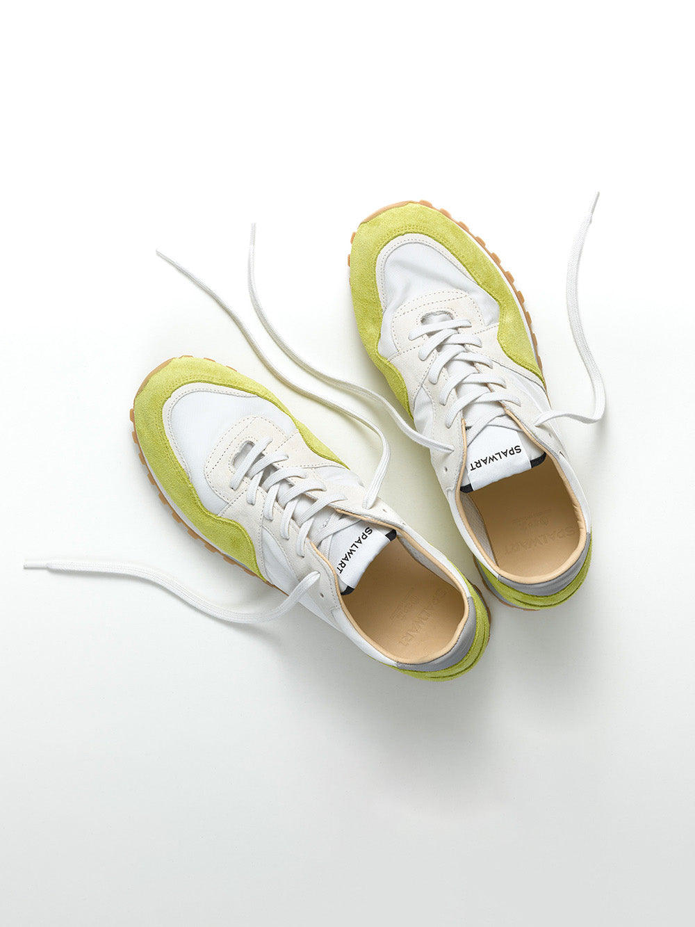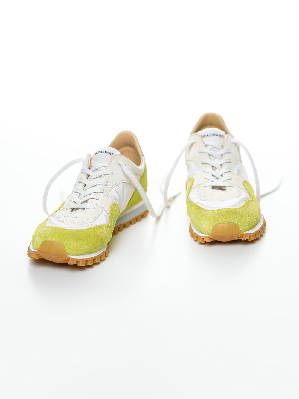 Sneakers Marathon Trail Low signées Spalwart sont des baskets basses en nylon et en cuir suédé vert pomme acidulé. Leur bout est rond, elles se ferment à l'aide de lacets blancs, le logo Spalwart est tissé sur la languette rembourrée, elles sont doublées en cuir et les semelles sont crantées en caoutchouc naturel.