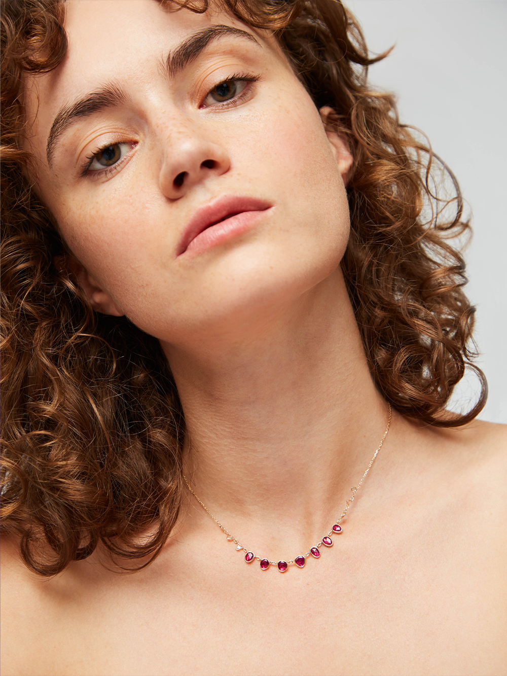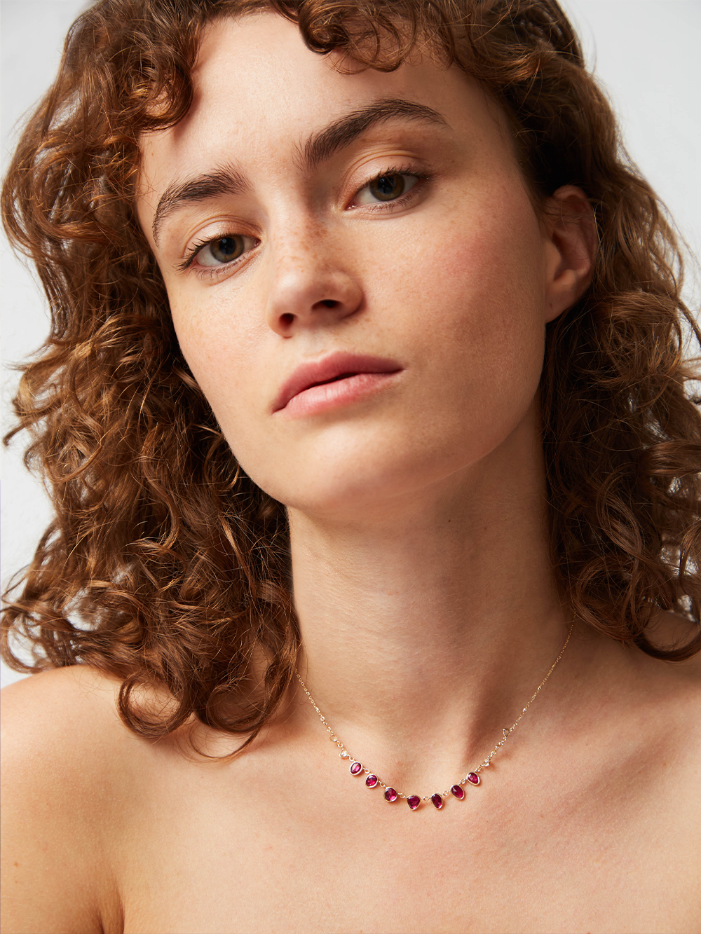 Ce collier rubis et diamants rosecut de Céline Daoust est réalisé en or jaune 14 carats. Chaque pierre précieuse a été sélectionnée à la main par Céline Daoust lors de ses voyages à l'étranger. Le diamant est l'emblème de la pureté de l'éternité et du pouvoir spirituel invincible. Le rubis est la pierre de la passion, et renforce le sentiment de confiance en soi.