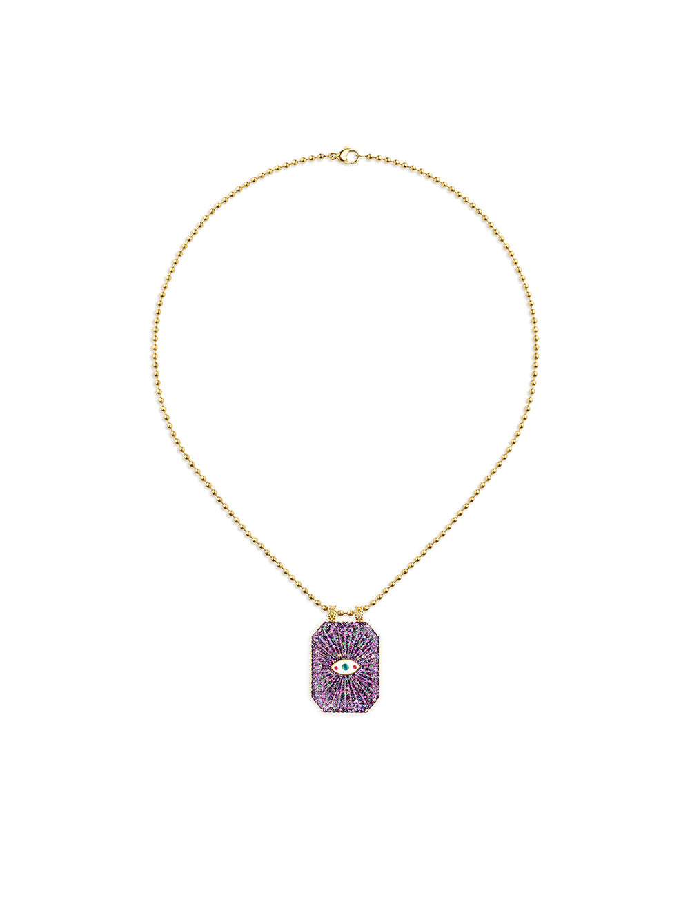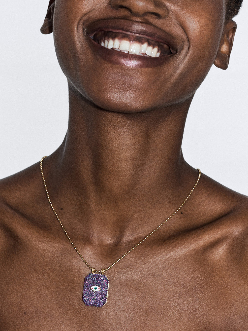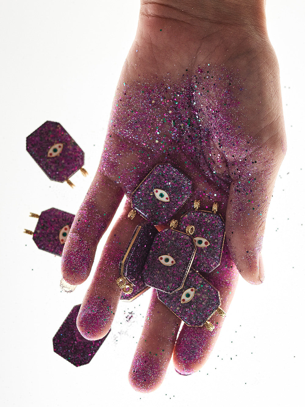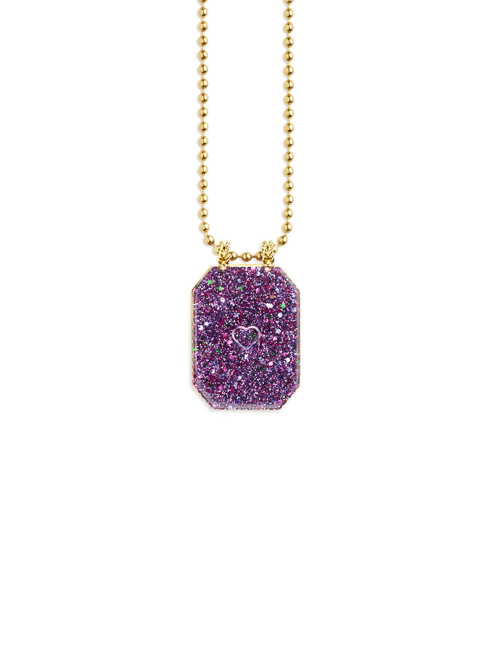 Scapulaire Raiz'in by Marie Lichtenberg confectionnée en résine incrustée de paillettes aux reflets violets. Une copie de l'emblématique scapulaire de la marque mais une vraie, fabriquée dans les ateliers français de la marque.
