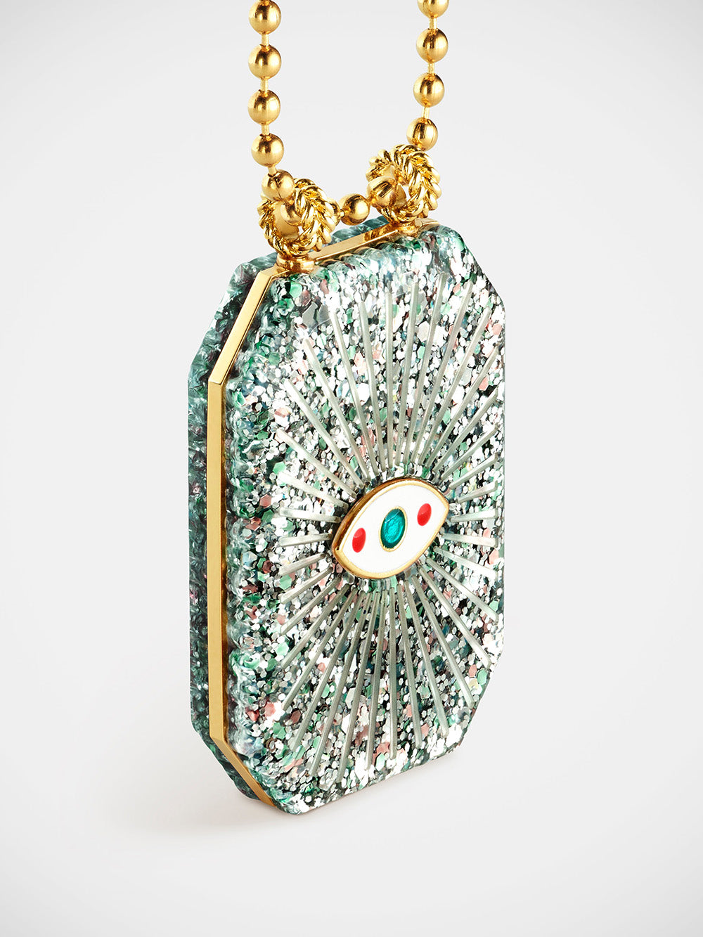 Scapulaire Raiz'in by Marie Lichtenberg confectionnée en résine incrustée de paillettes aux reflets argentés. Une copie de l'emblématique scapulaire de la marque mais une vraie, fabriquée dans les ateliers français de la marque.