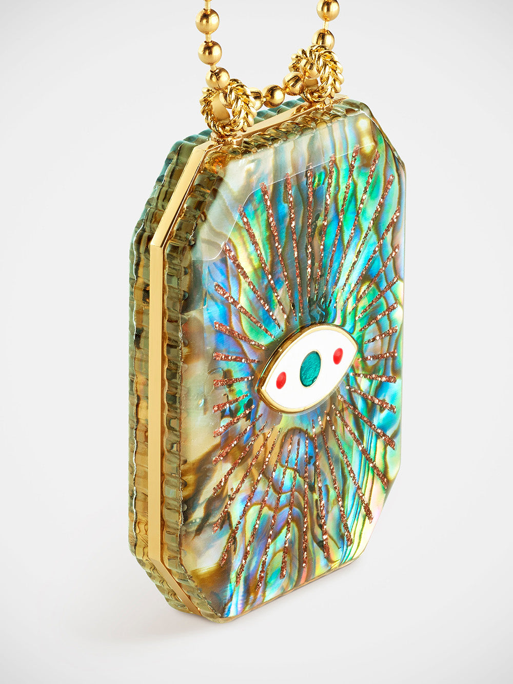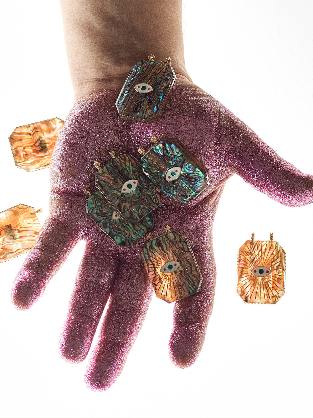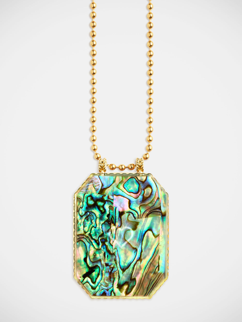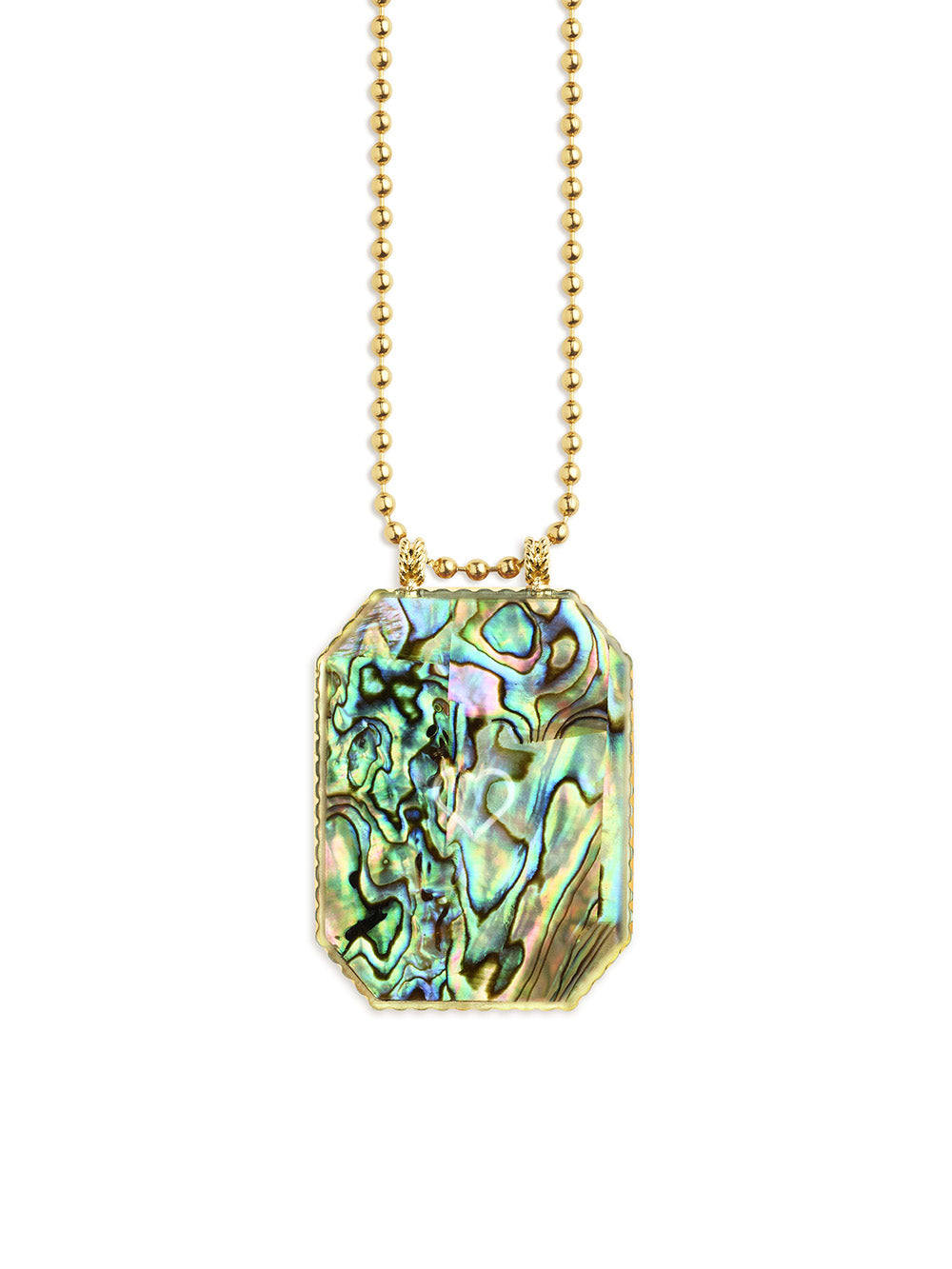 Scapulaire Raiz'in by Marie Lichtenberg confectionnée en résine incrustée de feuille de nacre aux reflets naturels. Une copie de l'emblématique scapulaire de la marque mais une vraie, fabriquée dans les ateliers français de la marque.